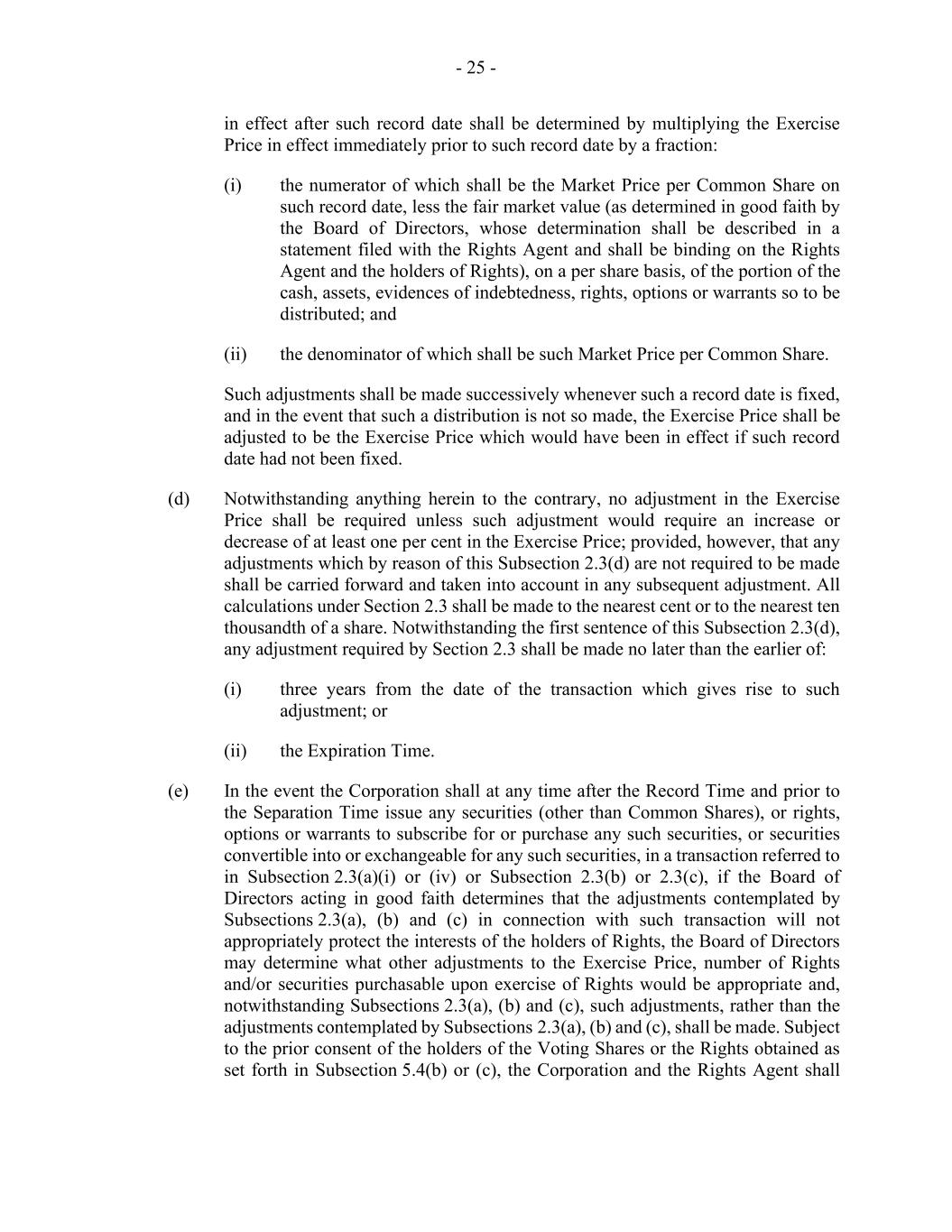 -25-在该记录日期之后生效的应通过将紧接该记录日期之前有效的行使价乘以分数确定:(i)其分子应为该记录日期的每股普通股市场价格,减去公平市场价值(由董事会善意确定,其确定应在向权利代理人提交的声明中描述,并对权利代理人和权利持有人具有约束力),以每股为基础,该部分现金、资产,债务、权利、期权或认股权证的证据将如此分配;及(ii)其分母应为每股普通股的市场价格。每当确定该记录日期时,应先后作出该等调整,而在未如此分配的情况下,应将行权价格调整为在该记录日期未确定的情况下本应有效的行权价格。(d)尽管本文另有相反规定,但无须调整行使价,除非该等调整将要求增加或减少至少百分之一的行使价;但如因本款第2.3(d)款而无须作出的任何调整,则须结转,并在任何其后的调整中予以考虑。根据第2.3条进行的所有计算,均须按最接近的一分或最接近的万分之一份额进行。尽管有本款第2.3(d)款第一句的规定,第2.3条所规定的任何调整,须不迟于以下较早者作出:(i)自引起该调整的交易日期起计三年;或(ii)届满时间。(e)如公司须在记录时间后及分立时间前的任何时间,在第2.3(a)(i)或(iv)款或第2.3(b)或2.3(c)款所提述的交易中,发行任何证券(普通股除外),或认购或购买任何该等证券的权利、期权或认股权证,或可转换为或可交换为任何该等证券的证券,则如本着诚意行事的董事会确定第2.3(a)款所设想的调整,(b)及(c)就该等交易而言,将不会适当保护权利持有人的利益,董事会可决定对行使价格、行使权利时可购买的权利和/或证券的数目作出哪些其他调整将是适当的,且尽管有第2.3(a)、(b)及(c)款的规定,仍须作出该等调整,而非第2.3(a)、(b)及(c)款所设想的调整。在有表决权的股份或根据第5.4(b)或(c)款所取得的权利的持有人事先同意的情况下,公司及权利代理人须