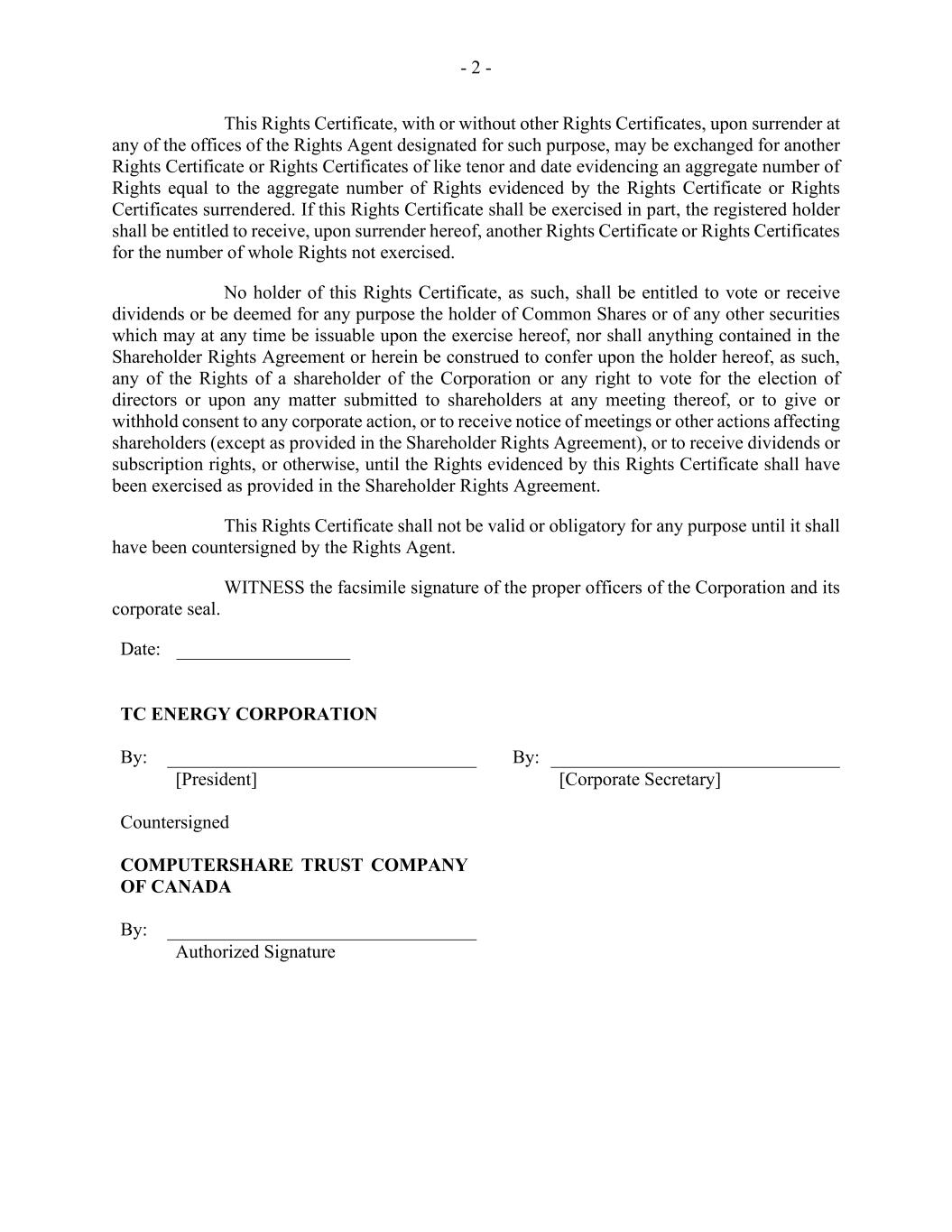 -2-本权利证书,无论有无其他权利证书,在指定用于此目的的权利代理人的任何办事处交出时,可交换另一份权利证书或相同期限和日期的权利证书,以证明权利总数等于所交出的权利证书或权利证书所证明的权利总数。如本权利证书须部分行使,则登记持有人在交出本权利证书后,有权领取另一份权利证书或未行使的完整权利数量的权利证书。本权利证书持有人本身无权投票或收取股息,或为任何目的被视为普通股或任何其他在行使本协议时可随时发行的证券的持有人,也不得解释为股东权利协议或本协议中所载的任何内容将公司股东的任何权利或任何投票选举董事的权利或在其任何会议上提交给股东的任何事项的任何权利授予本协议的持有人,或给予或拒绝同意任何公司行动,或接收会议通知或其他影响股东的行动(股东权利协议规定的除外),或收取股息或认购权,或其他方式,直至本权利证书所证明的权利已按股东权利协议的规定行使。本权利证书经权利代理人会签后,不得为任何目的有效或具有义务性。见证公司适当人员的传真签字及其法团印章。日期:TC ENERGY CORPORATION by:by:[总裁] [公司秘书] Countersigned ComputerShareTrust Company of Canada by:authorized signature