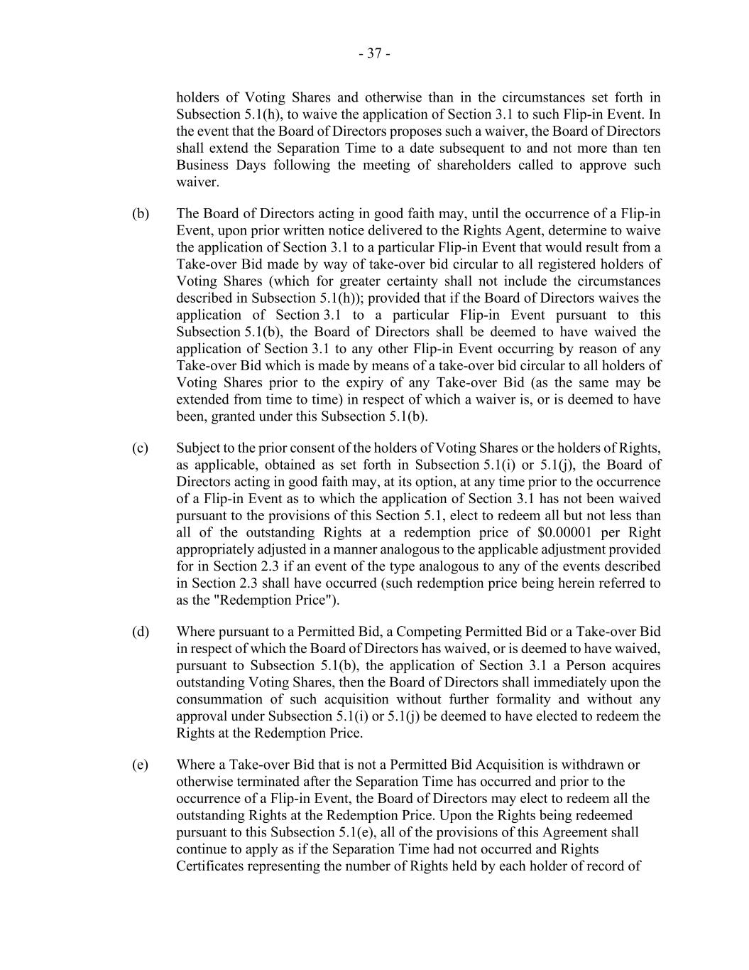 -37-有表决权股份的持有人,以及在第5.1(h)款所列情况以外的情况下,豁免第3.1节对该翻转事件的适用。如董事会提出该项豁免,董事会须将分立时间延长至召开股东大会批准该项豁免后的日期,且不超过其后十个营业日。(b)善意行事的董事会可在发生翻转事件前,在事先向权利代理人送达书面通知后,决定放弃将第3.1节适用于某一特定翻转事件,而该特定翻转事件将由通过向所有已登记的有表决权股份持有人发出的收购要约通知(为了更大的确定性,该通知不包括第5.1(h)款所述的情况);但如董事会根据本款第5.1(b)款放弃将第3.1节适用于某一特定翻转事件,董事会应被视为已放弃将第3.1节适用于因任何收购要约而发生的任何其他翻转事件,而该收购要约是在任何收购要约(可能不时延长)届满前以收购要约通函的方式向所有有表决权股份持有人作出的,而根据本第5.1(b)款已就该要约授予或被视为已授予豁免。(c)在根据第5.1(i)或5.1(j)款取得有表决权股份持有人或权利持有人(如适用)的事先同意的情况下,善意行事的董事会可根据其选择,在未根据本条第5.1条的规定放弃第3.1条的适用的翻转事件发生之前的任何时间,如果发生了类似于2.3节中所述任何事件的类型的事件(此种赎回价格在此称为“赎回价格”),则选择以以类似于2.3节中规定的适用调整的方式适当调整的每项权利0.00001美元的赎回价格赎回所有但不少于所有未偿权利。(d)凡根据许可出价、竞合许可出价或收购要约,而董事会已根据第5.1(b)款放弃或被当作已放弃第3.1节的申请,某人取得已发行的有表决权股份,则董事会须在该收购完成后立即在没有进一步手续且未经根据第5.1(i)或5.1(j)款任何批准的情况下,被视为已选择按赎回价格赎回该权利。(e)凡非许可的收购要约在分立时间发生后且在发生翻转事件之前被撤回或以其他方式终止,董事会可选择按赎回价格赎回所有未行使的权利。在根据本款第5.1(e)款赎回权利时,本协议的所有条款应继续适用,犹如分离时间未发生和代表每个记录持有人所持有的权利数量的权利证书