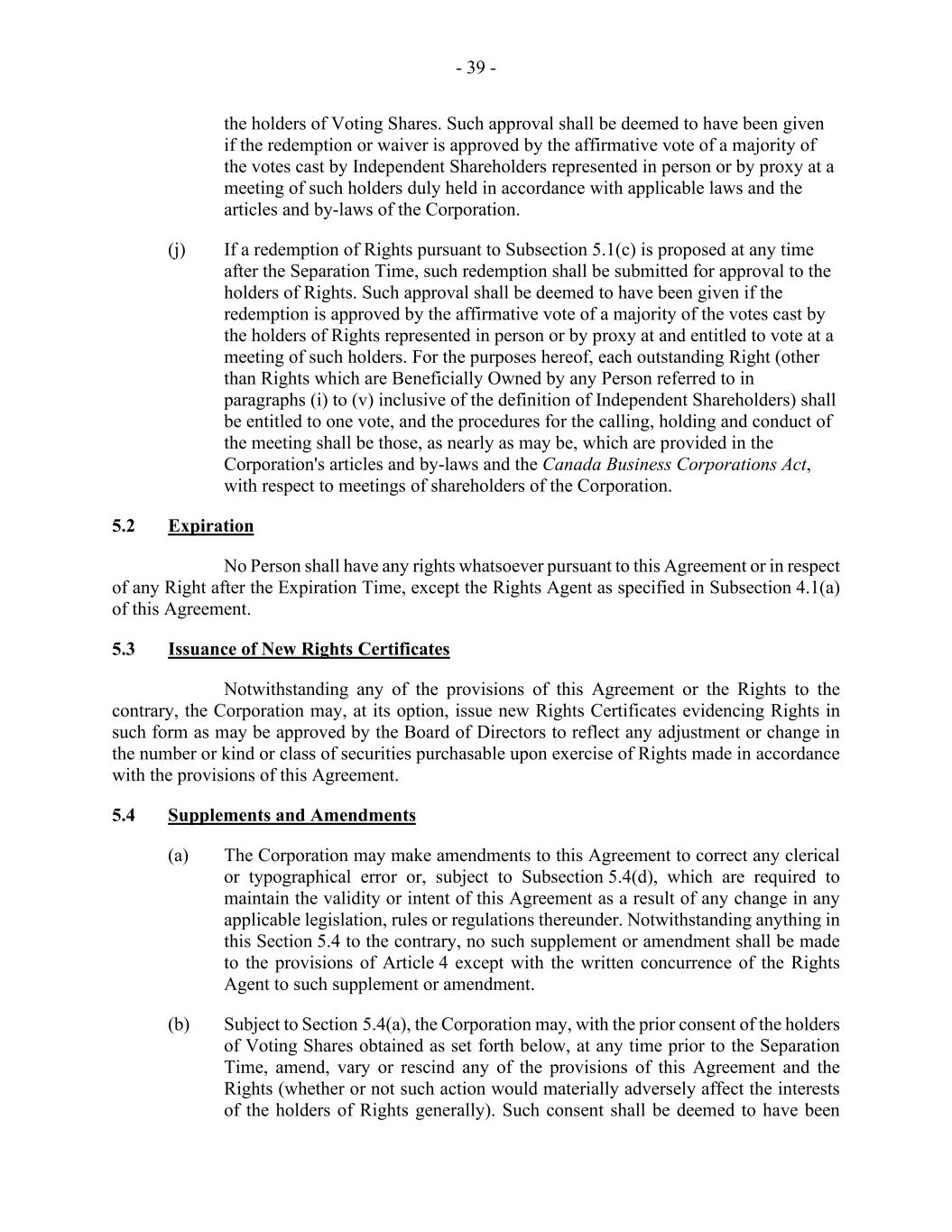-39-有表决权股份持有人。如果赎回或放弃获得根据适用法律和公司章程和细则正式召开的独立股东会议上亲自或通过代理人代表的独立股东所投多数票的赞成票批准,则该批准应被视为已给予。(j)如根据第5.1(c)款在分立时间后的任何时间提出赎回权利,则该赎回须提交权利持有人批准。如果赎回以亲自或委托代理人代表并有权在该等持有人会议上投票的权利持有人所投的多数票的赞成票获得批准,则该等批准应被视为已给予。就本协议而言,每项尚未行使的权利(不包括独立股东定义在内的第(i)至(v)段中提及的任何人实益拥有的权利)应有权投一票,召集、召开和举行会议的程序应尽可能接近于公司章程和细则以及《加拿大商业公司法》中规定的与公司股东会议有关的程序。5.2期满后,任何人不得依据本协议或就任何权利享有任何权利,但本协议第4.1(a)款规定的权利代理人除外。5.3尽管有本协议的任何规定或相反的权利,发行新的权利证书,公司可自行选择以董事会批准的形式发行证明权利的新权利证书,以反映根据本协议的规定行使权利时可购买的证券数量或种类或类别的任何调整或变化。5.4补充和修正(a)公司可对本协议作出修正,以更正任何文书或印刷错误,或在不违反第5.4(d)款的情况下,因本协议下任何适用的立法、规则或条例的任何变更而需要维持本协议的有效性或意图。尽管本条第5.4款另有相反规定,除非权利代理人书面同意,否则不得对第4条的规定作此种补充或修正。(b)在符合第5.4(a)条的规定下,公司可在分立时间之前的任何时间,在获得下述有表决权股份持有人事先同意的情况下,修订、更改或撤销本协议和权利的任何条款(无论该等行动是否会对权利持有人的一般利益产生重大不利影响)。此种同意应被视为已