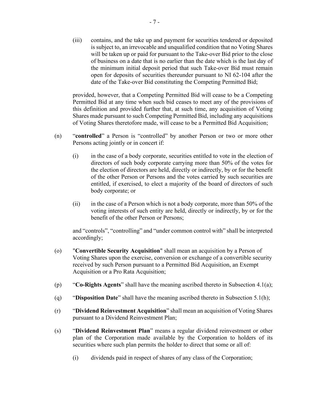 -7-(iii)载有一项不可撤销的无条件条件,即在不早于该等收购要约必须在构成竞争许可出价的收购要约日期后根据NI 62-104保持开放的最低初始存款期的最后一天的日期,即在营业时间结束前,不会根据收购要约接受或支付任何有表决权的股份,且就投标或交存的证券的接受和支付须受此项不可撤销的无条件条件所规限;但前提是,当竞合许可出价不再符合本定义的任何规定时,竞合许可出价将在任何时候不再是竞合许可出价,并进一步规定,届时,根据该竞合许可出价进行的任何有表决权股份的收购,包括此前进行的任何有表决权股份的收购,将不再是允许的出价收购;(n)“受控制”的人由另一人或两个或两个以上共同或一致行动的其他人“控制”,如果:(i)在法人团体的情况下,有权在该法人团体的董事选举中投票并在选举董事时获得50%以上选票的证券,由另一人或多人直接或间接持有或为另一人或多人的利益持有,而该等证券所持有的选票如获行使,有权选举该法人团体的董事会过半数;或(ii)如属非法人团体的人士,则直接或间接持有该实体超过50%的表决权权益,(o)“可转换证券收购”系指有表决权的人根据许可的出价收购在行使、转换或交换其收到的可转换证券时取得的股份,豁免收购或按比例收购;(p)“共同权利代理人”应具有第4.1(a)款所赋予的含义;(q)“处置日期”应具有第5.1(h)款所赋予的含义;(r)“股息再投资收购”系指根据股息再投资计划收购有表决权的股份;(s)“股息再投资计划”系指公司向其证券持有人提供的定期股息再投资或其他计划,而该计划允许持有人指示部分或全部:(i)就公司任何类别的股份支付的股息;