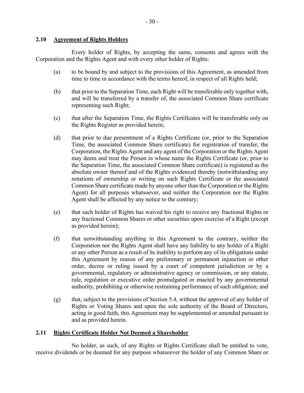 -30-2.10权利持有人的协议每一权利持有人通过接受该协议,同意并同意公司和权利代理人以及每一其他权利持有人:(a)就所持有的所有权利受本协议条款的约束并受其约束,该条款经不时根据本协议条款修订;(b)在分立时间之前,每项权利将只能与,并将通过转让,代表该权利的相关普通股证书;(c)在分立时间后,权利证书将只能按本协议规定在权利登记册上转让;(d)在适当出示权利证书(或在分立时间之前,相关的普通股证书)以进行转让登记之前,公司、权利代理人和公司的任何代理人或权利代理人可将权利证书(或,在分立时间之前,相关的普通股证书)为所有目的而登记为其及其所证明的权利的绝对拥有人(尽管在该权利证书或由公司或权利代理人以外的任何人作出的相关普通股证书上有任何所有权标记或文字),而公司或权利代理人均不受任何相反通知的影响;(e)该权利持有人已放弃在行使权利时收取任何零碎权利或任何零碎普通股或其他证券的权利(本协议规定的除外);(f)尽管本协议中有任何相反的规定,由于有管辖权的法院或政府、监管或行政机构或委员会发布的任何初步或永久禁令或其他命令、法令或裁决,或任何政府当局颁布或颁布的禁止或以其他方式限制履行该义务的任何法规、规则、条例或行政命令,公司或权利代理人均不对任何权利持有人或任何其他人承担任何责任;(g),在不违反第5.4节规定的情况下,未经任何权利或有表决权股份持有人的批准,并经董事会唯一授权,本着诚意行事,本协议可根据本协议的规定并按本协议的规定予以补充或修订。2.11权利证书持有人不被视为股东任何权利或权利证书的持有人本身均无权投票、收取股息或被视为出于任何目的任何普通股的持有人或