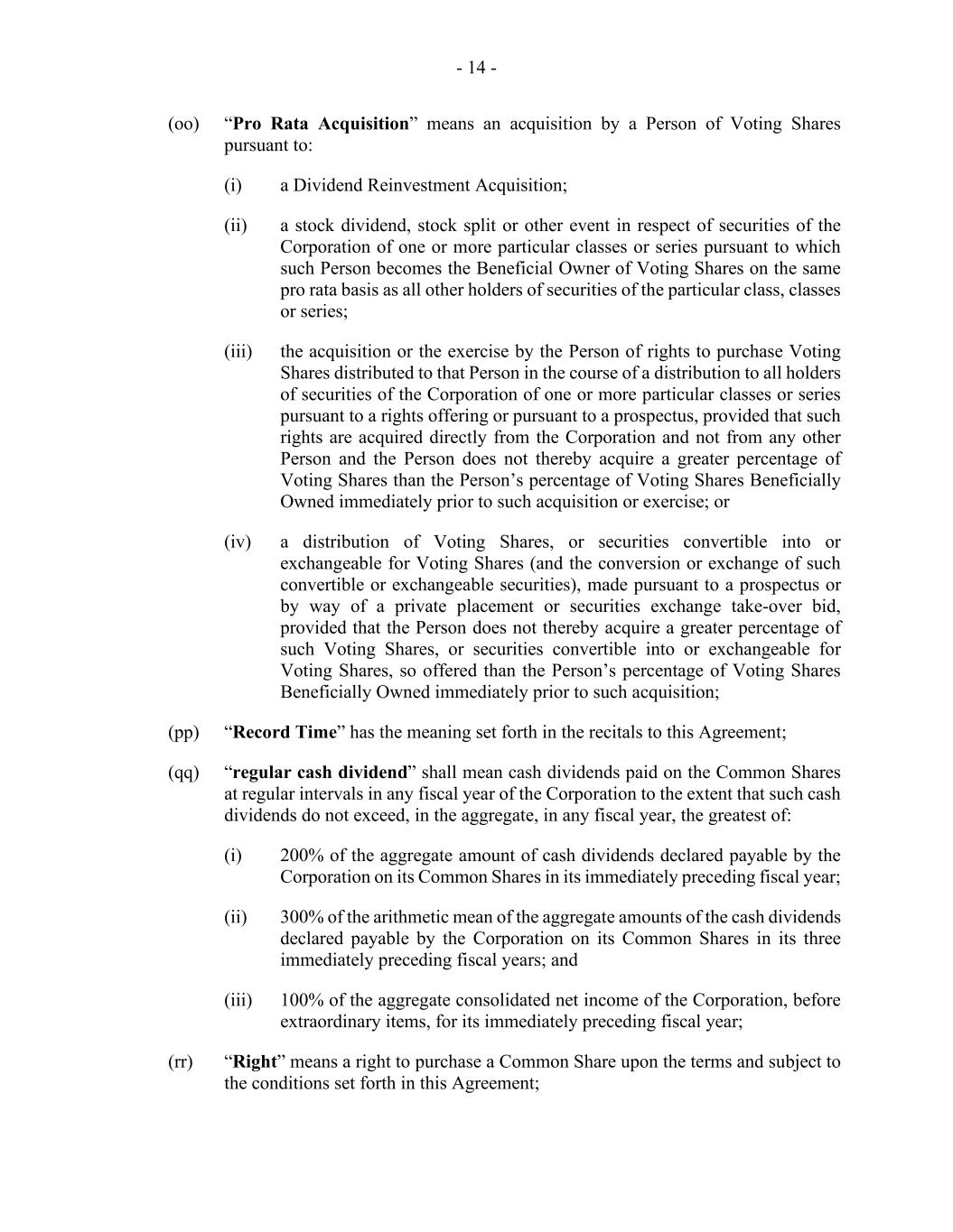 -14-(oo)“按比例收购”是指有表决权的人根据以下情况收购股份:(i)股息再投资收购;(ii)与一个或多个特定类别或系列的公司证券有关的股票股息、股票分割或其他事件,据此,该人成为有表决权股份的实益拥有人,其比例与特定类别证券的所有其他持有人相同,类别或系列;(iii)根据供股或根据招股章程向公司所有特定类别或系列的证券持有人进行分销过程中,收购或行使购买向该人分发的有表决权股份的权利,前提是这些权利是直接从公司而不是从任何其他人那里获得的,并且该人因此获得的有表决权股份的百分比不高于该人在紧接此类收购或行使之前实益拥有的有表决权股份的百分比;或(iv)根据招股说明书或通过私募或证券交易所收购要约的方式进行的有表决权股份或可转换为或可交换为有表决权股份的证券的分配(以及此类可转换或可交换证券的转换或交换),前提是该人因此获得的此类有表决权股份或可转换为或可交换为有表决权股份的证券的百分比不高于紧接此类收购之前该人实益拥有的有表决权股份的百分比;(pp)“记录时间”具有本协议复述中规定的含义;(qq)“定期现金股息”系指在公司任何财政年度定期支付的普通股现金股息,但该现金股息在任何财政年度的总额不超过,最大者:(i)公司在紧接其上一个财政年度就其普通股宣布应付的现金股息总额的200%;(ii)公司在紧接其上三个财政年度就其普通股宣布应付的现金股息总额的算术平均数的300%;及(iii)公司在非常项目前的综合净收入总额的100%,对于其紧接的上一个会计年度;(rr)“权利”是指根据本协议规定的条款和条件购买普通股的权利;