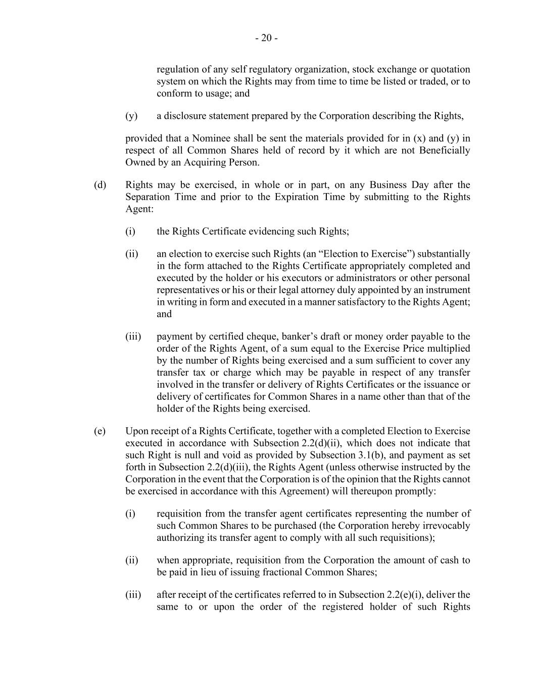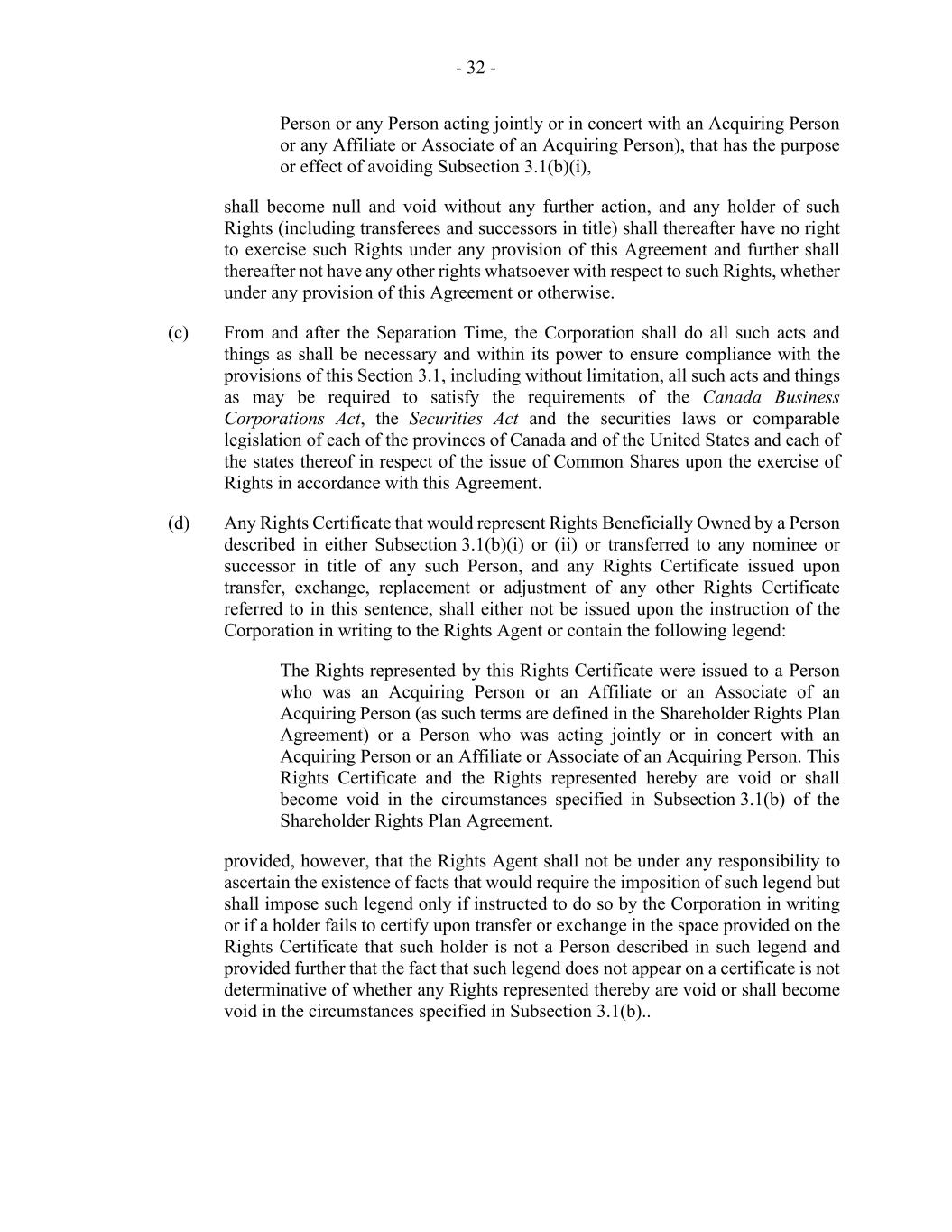 -32-具有撤销第3.1(b)(i)款的目的或效力的人或与收购人或收购人的任何关联公司或关联人共同或一致行动的任何人),在不采取任何进一步行动的情况下将成为无效,且该等权利的任何持有人(包括所有权上的受让人和继承人)此后将无权根据本协议的任何条款行使该等权利,并且此后不得就该等权利拥有任何其他权利,无论是根据本协议的任何条款还是其他条款。(c)自分离时间起及之后,公司应在其权力范围内作出一切必要的行为和事情,以确保遵守本条3.1款的规定,包括但不限于为满足《加拿大商业公司法》的要求而可能需要的一切行为和事情,根据本协议行使权利时发行普通股的《证券法》和加拿大和美国各省及其各州的证券法或类似立法。(d)代表第3.1(b)(i)或(ii)款所述的人实益拥有的权利或转让给任何该等人的任何代名人或所有权继承人的任何权利证书,以及在转让、交换、替换或调整本句所指的任何其他权利证书时发出的任何权利证书,不得根据公司的书面指示向权利代理人发出或包含以下图例:本权利证书所代表的权利是发给作为收购人或收购人的关联公司或收购人的关联人(这些条款在股东权利计划协议中定义)的人,或与收购人或收购人的关联公司或关联人共同或一致行动的人。本权利证书和特此所代表的权利在股东权利计划协议第3.1(b)款规定的情况下无效或将成为无效。但前提是,权利代理人无须承担任何责任,以确定是否存在需要施加该传说的事实,但只有在公司以书面或如果持有人未能在权利证书上提供的空格中在转让或交换时证明该持有人不是该图例中描述的人,并进一步规定该图例未出现在证书上的事实并不能确定由此所代表的任何权利是否无效或在第3.1(b)款规定的情况下应成为无效.。