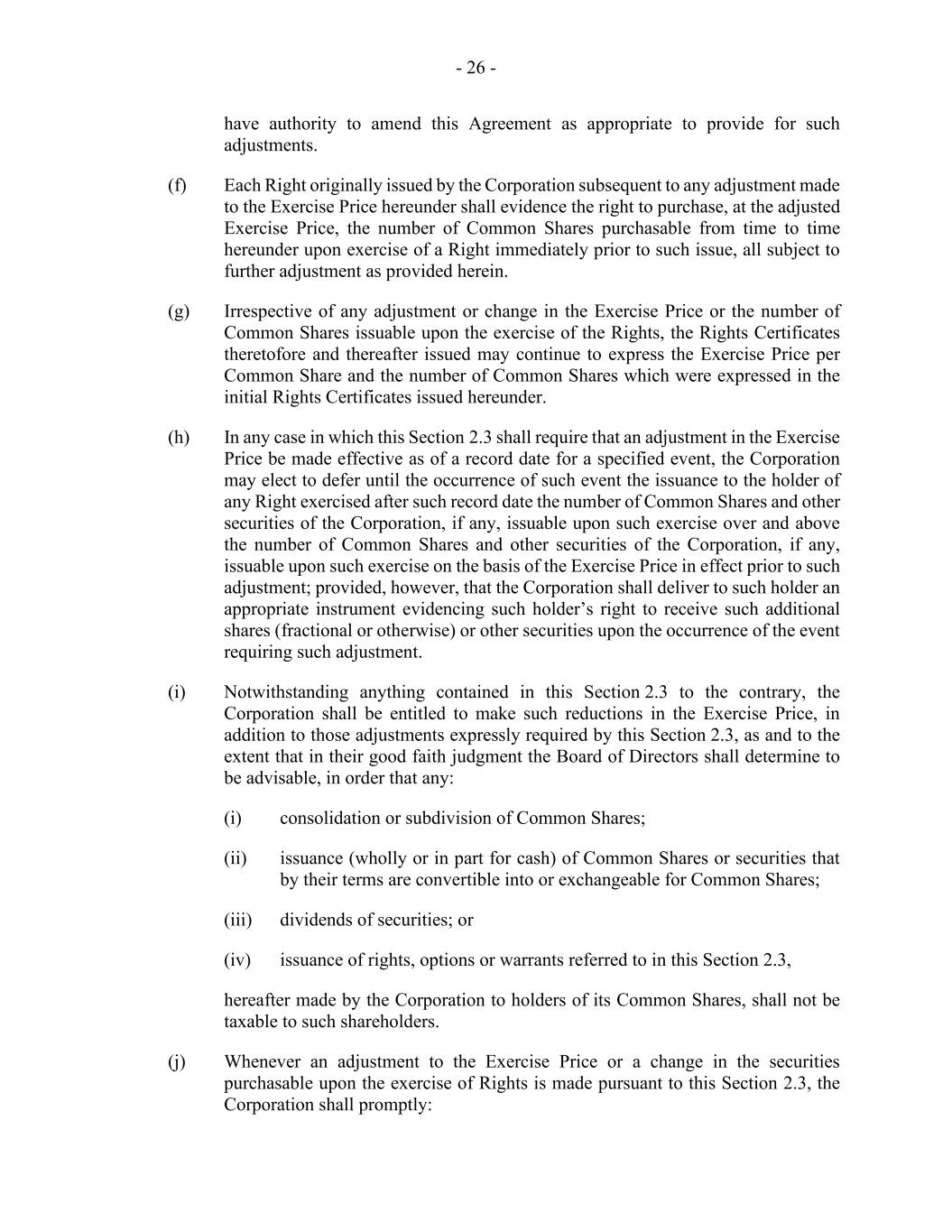 -26-有权酌情修改本协议,以规定此类调整。(f)公司在根据本协议对行使价格作出任何调整后最初发行的每一项权利,应证明有权在紧接本协议发行前行使一项权利时,以调整后的行使价格购买根据本协议不时可购买的普通股数量,所有这些权利均须按本协议规定进行进一步调整。(g)不论行使价格或行使权利时可发行的普通股数目有任何调整或变动,在此之前及之后发行的权利证书可继续表示每股普通股的行使价格及根据本协议发行的初始权利证书中所表示的普通股数目。(h)在任何情况下,如本条第2.3条规定行使价格的调整自指明事件的记录日期起生效,则公司可选择将在该事件发生时向在该记录日期后行使的任何权利的持有人发行的公司普通股及其他证券(如有的话)的数目,在该行使时可发行的数目超过公司普通股及其他证券(如有的话)的数目,可在此类行使时根据此类调整前有效的行使价格发行;但条件是,公司应向该持有人交付一份适当的文书,证明该持有人有权在需要此类调整的事件发生时获得此类额外股份(零碎或其他)或其他证券。(i)尽管本条第2.3条另有相反规定,除本条第2.3条明文规定的调整外,公司有权在行使价上作出削减,但以董事局在其善意判断中裁定为可取为限,为了使任何:(i)合并或拆细普通股;(ii)发行(全部或部分以现金形式)按其条款可转换为或可交换为普通股的普通股或证券;(iii)证券股息;或(iv)公司向其普通股持有人发行本条2.3中提及的权利、期权或认股权证,以下情况不对这些股东征税。(j)凡依据本条第2.3条对行使价格作出调整或在行使权利时可购买的证券发生变动,公司须迅速: