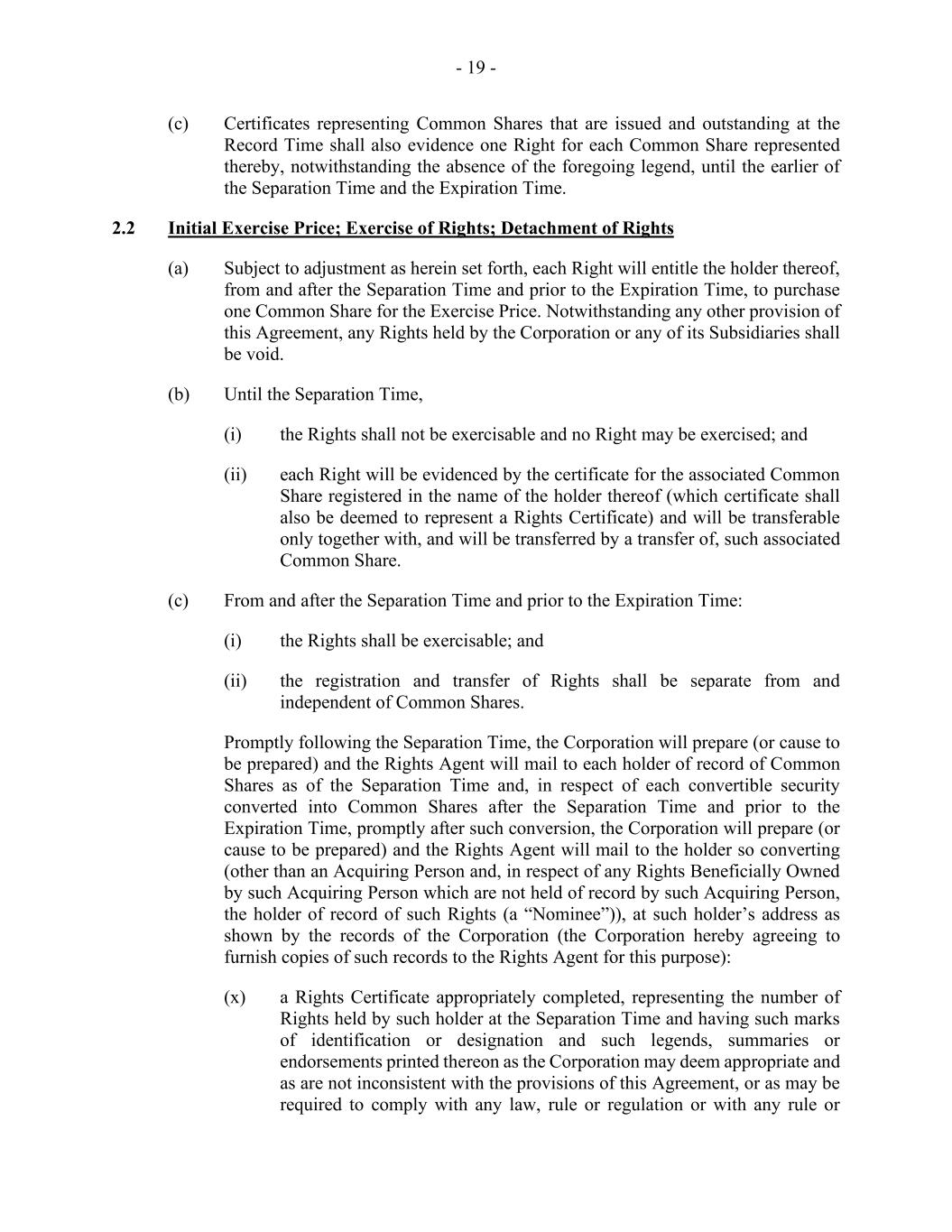-19-(c)在记录时间已发行和流通的代表普通股的证书也应证明,尽管没有上述图例,但在分离时间和到期时间中较早者之前,对由此代表的每一普通股拥有一项权利。2.2初始行权价格;行使权利;分离权利(a)经此处规定的调整,每项权利的持有人将有权在分离时间和之后以及到期时间之前以行权价格购买一股普通股。尽管有本协议的任何其他规定,公司或其任何子公司持有的任何权利均无效。(b)在分立时间之前,(i)权利不得行使且不得行使任何权利;(ii)每项权利将由以其持有人名义登记的相关普通股的证书(该证书也应被视为代表权利证书)证明,并且只能与该相关普通股一起转让,并将通过转让该相关普通股的方式转让。(c)自分立时间及之后至届满时间之前:(i)权利应可行使;(ii)权利的登记和转让应与普通股分开并独立于普通股。在分立时间之后,公司将迅速准备(或促使准备)和权利代理人将邮寄给截至分立时间的普通股记录的每个持有人,就在分立时间之后和到期时间之前转换为普通股的每个可转换证券而言,在这种转换之后,公司将迅速准备(或促使准备)和权利代理人将邮寄给如此转换的持有人(收购人和,就该等收购人实益拥有的任何权利而言,该等权利的记录持有人(“被提名人”),在公司记录显示的该持有人地址(公司特此同意为此目的向权利代理人提供该等记录的副本):(x)适当填写的权利证书,代表该持有人在分离时间持有的权利数量,并具有该等识别或指定标记和该等图例,公司认为适当并与本协议的规定不抵触,或为遵守任何法律、规则或规例或任何规则或