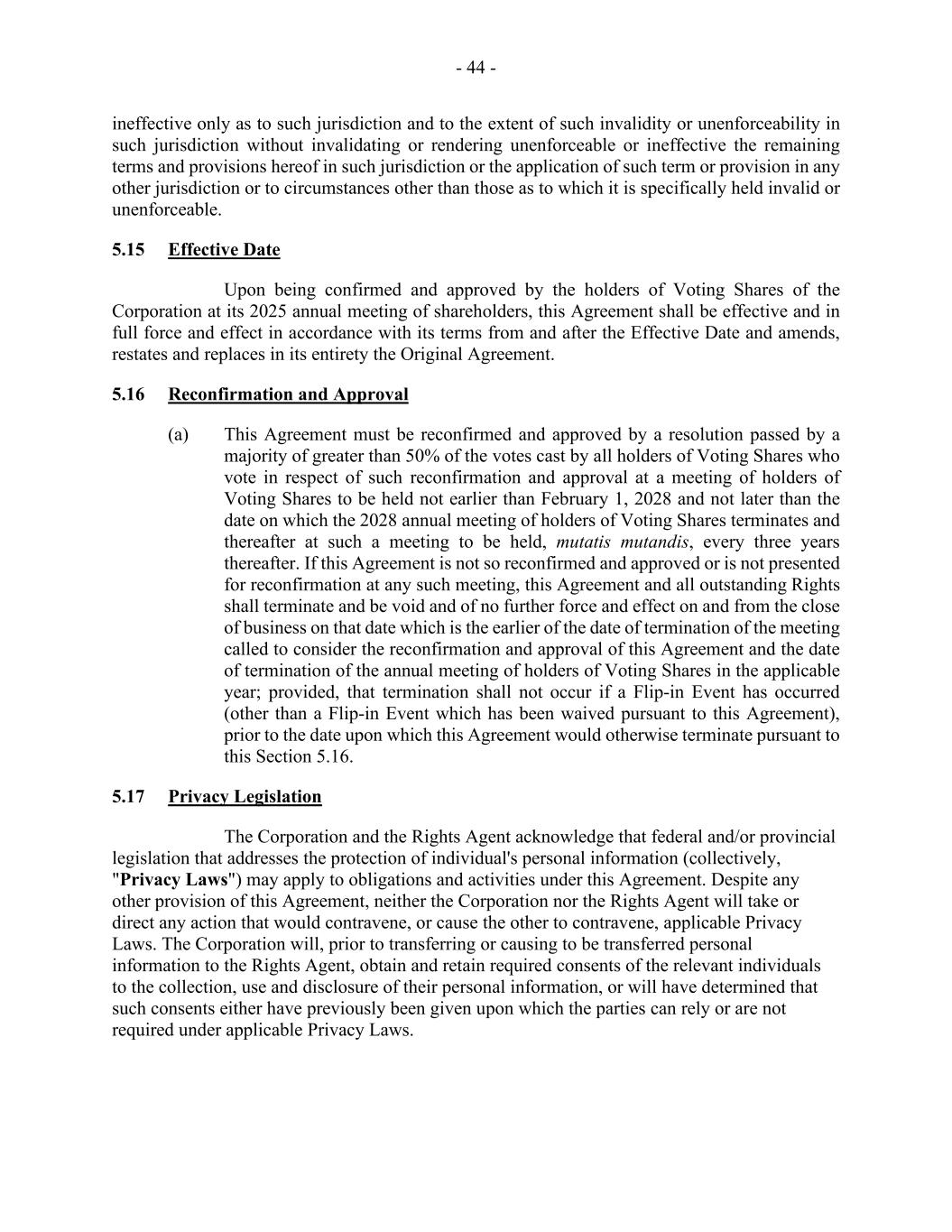 -44-仅对该司法管辖权无效,且在该司法管辖权内无效或不可执行的范围内,而不会使该司法管辖权内本条款的其余条款和规定或该条款或规定在任何其他司法管辖区的适用或对其具体被认定为无效或不可执行的情形以外的情形无效或使其不可执行或无效。5.15生效日期经公司2025年年度股东大会有表决权股份持有人确认并批准,本协议自生效日期及之后根据其条款生效并完全生效和生效,并对原协议进行修订、重述和全部替换。5.16重新确认和批准(a)本协议必须经在不早于2028年2月1日且不迟于2028年有表决权股份持有人年度会议终止之日举行的有表决权股份持有人会议上投票表决的所有有表决权股份持有人所投赞成票的50%以上的多数票通过的决议重新确认和批准,此后每隔三年在该次有表决权股份持有人年度会议上比照举行。如本协议未获如此重新确认及批准,或未在任何该等会议上提交重新确认,则本协议及所有尚未行使的权利自该日期的营业时间结束时(即为考虑重新确认及批准本协议而召开的会议终止日期与适用年度的有表决权股份持有人年度会议终止日期中较早的日期)起终止,且不再具有任何效力和效力;但,如果已发生翻转事件(根据本协议已被放弃的翻转事件除外),则在本协议根据本第5.16节另行终止之日之前,该终止不应发生。5.17隐私立法公司和权利代理人承认,涉及保护个人个人信息的联邦和/或省级立法(统称为“隐私法”)可适用于本协议项下的义务和活动。尽管本协议有任何其他规定,公司和权利代理人都不会采取或指示任何会违反或导致另一方违反适用的隐私法的行动。公司将在向权利代理人转让或促使其转让个人信息之前,获得并保留相关个人对收集、使用和披露其个人信息所需的同意,或将已确定此类同意要么先前已给予各方可依赖的同意,要么根据适用的隐私法不需要。