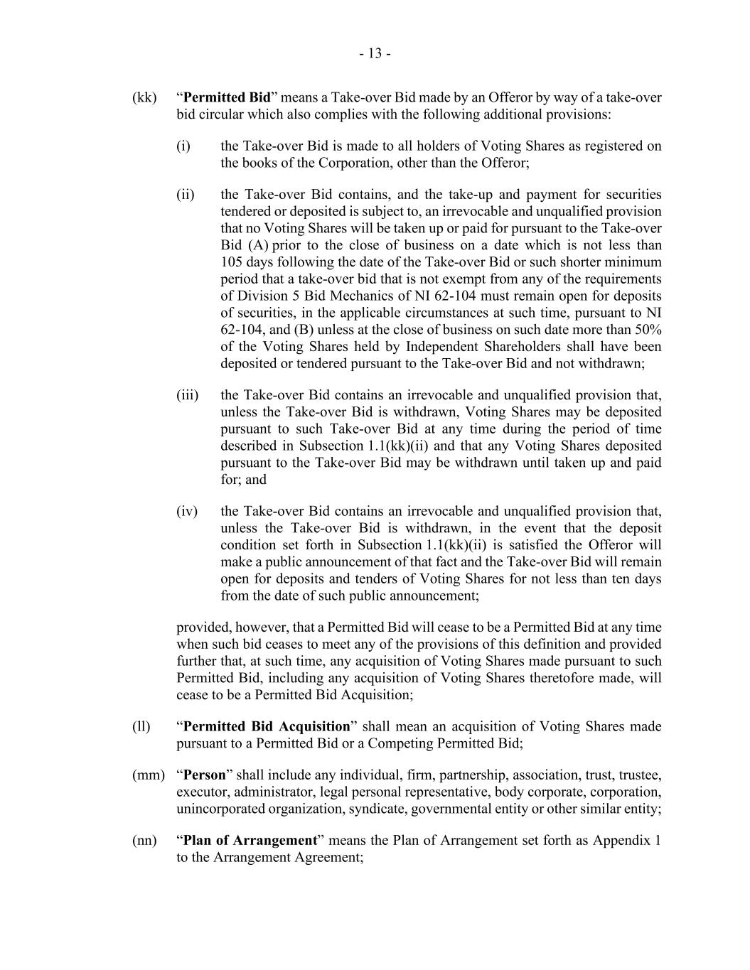 -13-(kk)“许可出价”指要约人以收购要约通函的方式作出的收购要约,该通函亦符合以下附加规定:(i)收购要约是向公司账簿上登记的所有有表决权股份持有人作出的,但要约人除外;(ii)收购要约包含,且要约或存放的证券的认购和付款受制于,不可撤销且无保留的规定,即在不少于收购要约日期后105天的日期或较短的最短期限内,在营业结束前,将不会根据收购要约(A)接受或支付任何有表决权的股份,在该时间的适用情况下,根据NI 62-104,不豁免于NI 62-104的第5分部投标机制的任何要求的收购要约必须继续开放存放证券,及(b)除非于该日期收市时,独立股东所持有的超过50%的有表决权股份已根据收购要约存入或投出,而非撤回;(iii)收购要约载有一项不可撤销及无保留的条文,除非收购要约被撤回,投票权股份可于第1.1(kk)(ii)款所述期间内的任何时间根据该等收购要约存入,而根据收购要约存入的任何投票权股份可撤回,直至被接纳及付清为止;及(iv)收购要约载有一项不可撤销及无保留的规定,除非收购要约被撤回,倘第1.1(kk)(ii)款所载的按金条件获得满足,要约人将就该事实作出公开公告,而收购要约将于该公告日期起计不少于十天内继续开放供有表决权股份的按金及投标;但条件是,当该等出价不再符合本定义的任何规定时,许可的出价将不再是许可的出价,并进一步规定,在该时间,根据该许可的出价进行的任何有表决权股份的收购,包括此前作出的任何有表决权股份的收购,将不再是许可的要约收购;(ll)“许可的要约收购”是指根据许可的出价或竞争性的许可出价作出的有表决权股份的收购;(mm)“人”应包括任何个人、商号、合伙企业、协会、信托、受托人、遗嘱执行人、管理人、法人代表、法人团体、公司、非法人组织、辛迪加、政府实体或其他类似实体;(nn)“安排计划”是指安排协议附录1所载的安排计划;