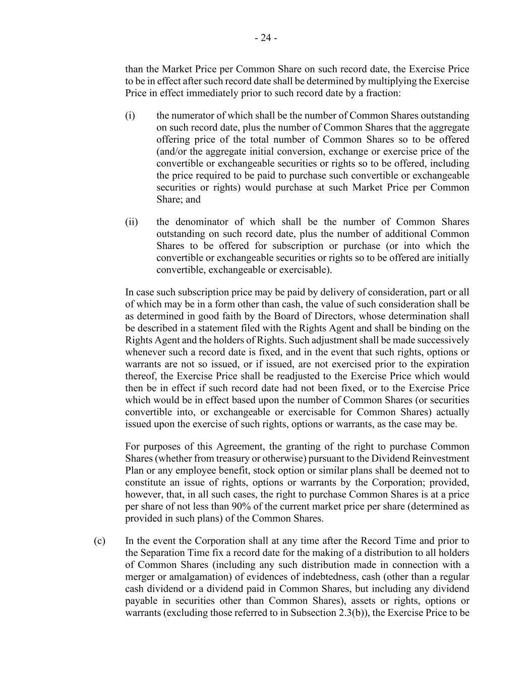 -24-比该记录日期的每股普通股市场价格,在该记录日期之后生效的行使价应通过将紧接该记录日期之前有效的行使价乘以一个零头来确定:(i)其分子应为该记录日期已发行在外的普通股数量,加上将如此发售的普通股总数的总发行价格(和/或总的初始转换,拟如此发售的可转换或可交换证券或权利的交换或行使价格,包括购买该等可转换或可交换证券或权利所需支付的价格)将按该市场价格每股普通股购买;(ii)其分母应为该记录日期已发行在外的普通股数量,加上拟供认购或购买的额外普通股数量(或拟如此发售的可转换或可交换证券或权利最初可转换、可交换或可行使)。如该等认购价可能以交付代价的方式支付,部分或全部可能采用现金以外的形式,则该等代价的价值应由董事会善意确定,其确定应在向权利代理人提交的声明中描述,并对权利代理人和权利持有人具有约束力。每当确定该记录日期时,应先后作出该等调整,如该等权利、期权或认股权证未如此发行,或如已发行,则在其到期前未获行使,则应将行权价格重新调整为在该记录日期未确定的情况下届时将生效的行权价格,或根据行使该等权利时实际发行的普通股(或可转换为、或可交换或可行使为普通股的证券)的数量而生效的行权价格,期权或认股权证,视情况而定。就本协议而言,根据股息再投资计划或任何员工福利、股票期权或类似计划授予购买普通股的权利(无论是从库存还是其他方式),应被视为不构成公司发行的权利、期权或认股权证;但前提是,在所有此类情况下,购买普通股的权利的每股价格不低于普通股当前市场价格的90%(根据此类计划的规定确定)。(c)如公司须在记录时间后及分立时间前的任何时间,订定记录日期,以将债务、现金(定期现金股息或以普通股支付的股息除外,但包括以普通股以外的证券支付的任何股息)、资产或权利、期权或认股权证(不包括第2.3(b)款所提述的那些)的证据分派予所有普通股股东(包括就合并或合并作出的任何该等分派),行使价为
