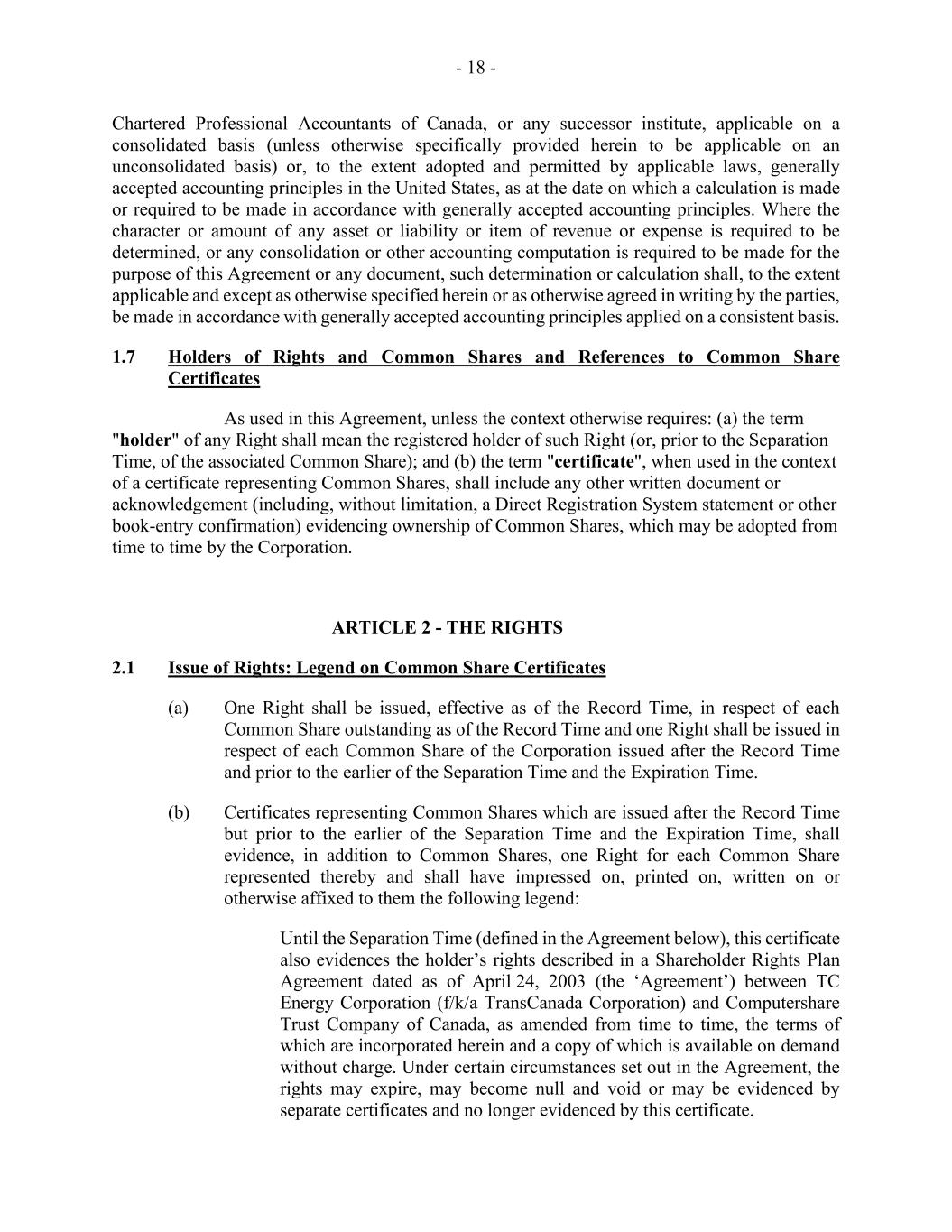 -18-加拿大特许专业会计师或任何继承协会,在合并基础上适用(除非本文另有具体规定,可在未合并基础上适用),或在适用法律采纳和允许的范围内,在根据公认会计原则进行计算或要求进行计算之日,在美国普遍接受的会计原则。凡要求确定任何资产或负债或收入或费用项目的性质或金额,或为本协议或任何文件的目的要求进行任何合并或其他会计计算,则该确定或计算应在适用的范围内且除本协议另有规定或各方书面另有约定外,按照在一致基础上适用的公认会计原则进行。1.7权利和普通股的持有人以及本协议中使用的提及普通股证书,除非上下文另有要求:(a)任何权利的“持有人”一词应指该权利(或在分离时间之前,相关普通股)的登记持有人;(b)“证书”一词在用于代表普通股的证书时,应包括证明普通股所有权的任何其他书面文件或确认书(包括但不限于直接登记制度声明或其他记账确认书),可由公司不时采纳。第2条-权利2.1发行权利:普通股权证图例(a)应就截至记录时间已发行的每一股普通股发行一项权利,自记录时间起生效,并应就在记录时间之后且在分立时间和到期时间(以较早者为准)之前发行的每一股公司普通股发行一项权利。(b)在记录时间之后但在分立时间和到期时间(以较早者为准)之前发行的代表普通股的证书,除普通股外,应证明对由此代表的每一普通股享有一项权利,并应在其上印有、印在其上、写在其上或以其他方式附加以下图例:在分立时间(定义见下文协议)之前,本证书还证明截至4月24日的股东权利计划协议中描述的持有人权利,2003(‘协议’)由TC Energy Corporation(f/k/a TransCanada Corporation)与加拿大ComputerShare信托公司签订,经不时修订,其条款并入本文,其副本可按需免费获得。在协议中规定的某些情况下,这些权利可能会到期,可能会成为无效或可能由单独的证书证明而不再由本证书证明。