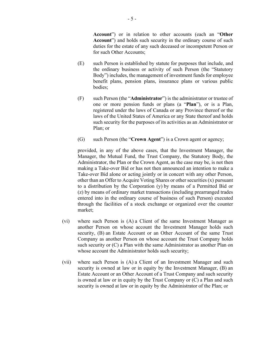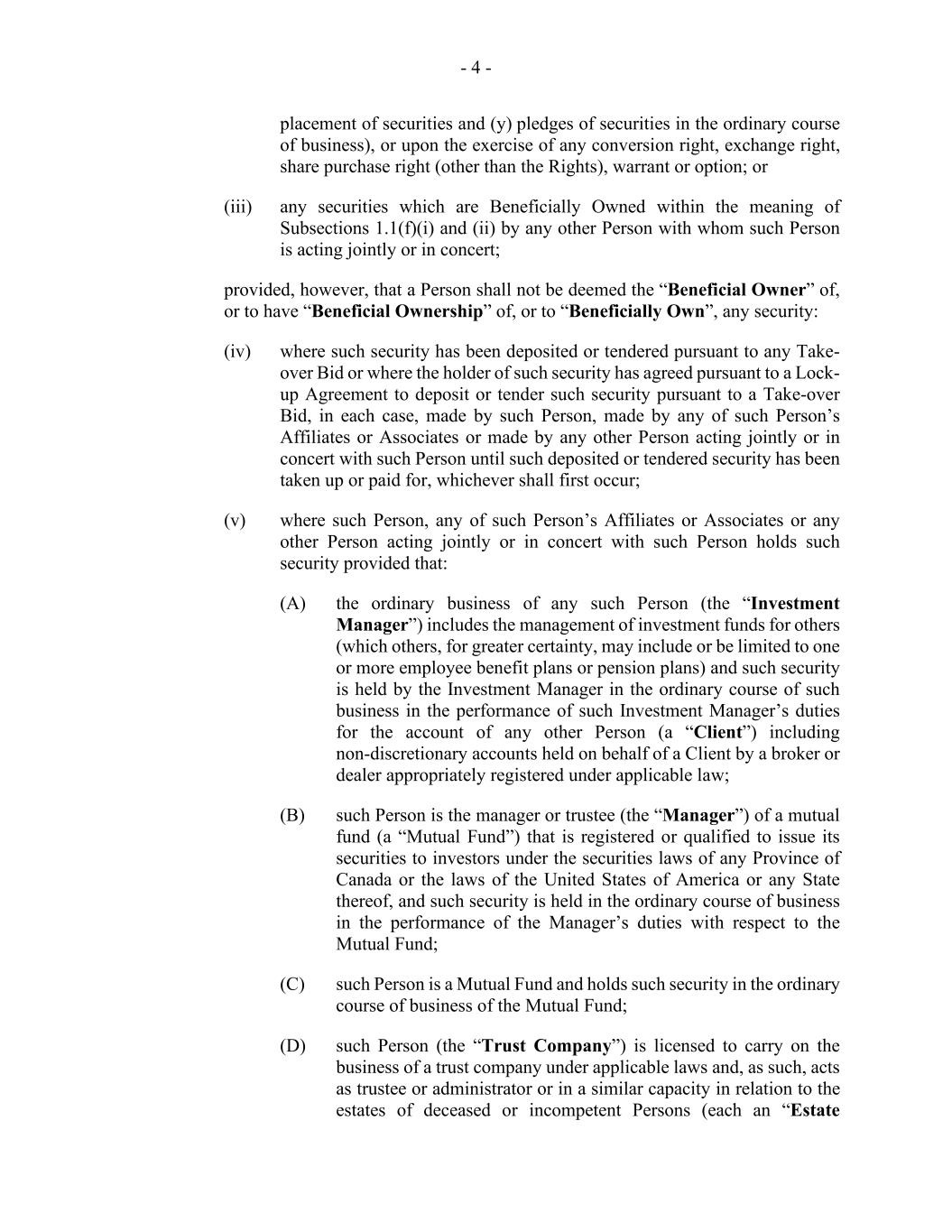 -4-在日常业务过程中配售证券及(y)质押证券),或在行使任何转换权、交换权、股份购买权(权利除外)、认股权证或期权时;或(iii)由与该人共同或一致行动的任何其他人在第1.1(f)(i)及(ii)款所指的任何证券实益拥有;但条件是,任何人不得被视为“实益拥有人”,或被视为“实益拥有人”,或被视为“实益拥有人”,任何证券:(iv)凡该等证券已根据任何收购要约存入或呈交,或该等证券的持有人已根据锁定协议同意根据收购要约存入或呈交该等证券,在每种情况下,均由该等人作出、由该等人的任何关联公司或联营公司作出或由与该等人共同或一致行动的任何其他人作出,直至该等已存入或呈交的证券已被占用或付清为止,以先发生者为准;(v)如该等人,任何该等人的关联公司或联营公司或与该等人共同或一致行动的任何其他人持有该等证券,但条件是:(a)任何该等人(“投资管理人”)的日常业务包括为他人管理投资基金(为了更大的确定性,其他人,可包括或限于一项或多项雇员福利计划或养老金计划),且该等证券由投资经理在该等业务的日常过程中为任何其他人(“客户”)的账户履行该投资经理的职责而持有,包括由根据适用法律适当注册的经纪人或交易商代表客户持有的非全权委托账户;(b)该人是共同基金(“共同基金”)的经理或受托人(“管理人”)根据加拿大任何省的证券法或美利坚合众国或其任何州的法律注册或有资格向投资者发行其证券,且该等证券是在管理人履行与共同基金有关的职责的正常业务过程中持有的;(c)该人是共同基金,并在共同基金的正常业务过程中持有该等证券;(d)该人(“信托公司”)根据适用法律获许可经营信托公司的业务,并且,因此,就已故或不称职人士的遗产担任受托人或管理人或以类似身份行事(每项“遗产