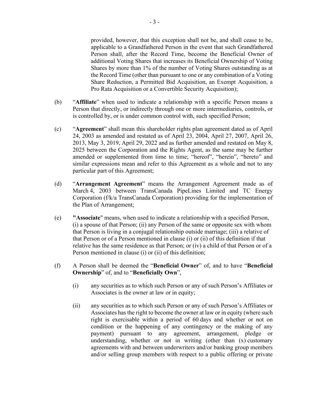 -3-但条件是,如果在记录时间后,该祖父成为额外有表决权股份的实益拥有人,使其有表决权股份的实益拥有权增加超过截至记录时间已发行有表决权股份数量的1%(根据有表决权股份减少、许可的要约收购、豁免收购的一项或任何组合,a按比例收购或可转换证券收购);(b)用于表明与特定人的关系的“关联关系”是指直接或通过一个或多个中间人间接控制该特定人,或由该特定人控制,或与该特定人处于共同控制之下的人;(c)“协议”是指这份日期为2003年4月24日的股东权利计划协议,经修订和重述,截至2004年4月23日、2007年4月27日、2013年4月26日、2019年5月3日、2022年4月29日,并于5月8日进一步修订和重述,公司与权利代理人之间的2025,如同时可能进一步修订或补充;“本协议”、“本协议”、“本协议”及类似表述是指和指本协议整体,而不是指本协议的任何特定部分;(d)“安排协议”是指TransCanada PipeLines Limited与TC Energy Corporation(f/k/a TransCanada Corporation)于2003年3月4日就安排计划的实施作出的安排协议;(e)“联系人”是指,当用于表明与特定人员的关系时,(i)该人的配偶;(ii)与该人在婚外以夫妻关系生活的任何同性或异性;(iii)该人的亲属或本定义第(i)或(ii)条所述的人的亲属,如果该亲属与该人的住所相同;或(iv)该人或本定义第(i)或(ii)条所述的人的子女;(f)该人应被视为该人的“实益拥有人”,并拥有该人的“实益拥有人”,并“实益拥有人”,(i)该等人或该等人的任何附属公司或联营公司在法律上或权益上为拥有人的任何证券;(ii)该等人或该等人的任何附属公司或联营公司有权根据任何协议、安排、质押或谅解在法律上或权益上成为拥有人的任何证券(如该等权利可在60天内行使,且不论是否有条件或发生任何意外情况或作出任何付款),不论是否以书面(除(x)与承销商和/或银行集团成员和/或销售集团成员之间就公开发售或非公开发行的惯常协议外