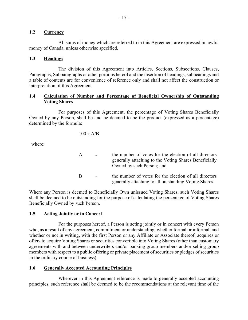 -17-1.2货币本协议中提及的所有金额均以加拿大合法货币表示,除非另有说明。1.3标题本协议分为条款、节、款、款、款或本协议其他部分,并插入标题、副标题和目录,仅供参考,不影响本协议的构建或解释。1.4就本协议而言,计算已发行有表决权股份的实益所有权的数量和百分比,即任何人实益拥有的有表决权股份的百分比,应并被视为由以下公式确定的乘积(以百分比表示):100 x A/b其中:A =一般附加于该人实益拥有的有表决权股份的所有董事的选举票数;B =一般附加于所有已发行有表决权股份的所有董事的选举票数。凡任何人被视为实益拥有未发行的有表决权股份,就计算该人实益拥有的有表决权股份的百分比而言,该等有表决权股份应被视为已发行。1.5共同或一致行动就本协议而言,一人是与每一人共同或一致行动,而每一人因任何正式或非正式的协议、承诺或谅解(不论是否以书面形式)而与第一人或其任何附属公司或联系人,收购或要约收购有表决权股份或可转换为有表决权股份的证券(与承销商和/或银行集团成员和/或出售集团成员之间就公开发售或私募证券或证券质押在日常业务过程中达成的惯常协议除外)。1.6公认会计原则凡在本协议中提及公认会计原则,则该提及应被视为在相关时间的建议