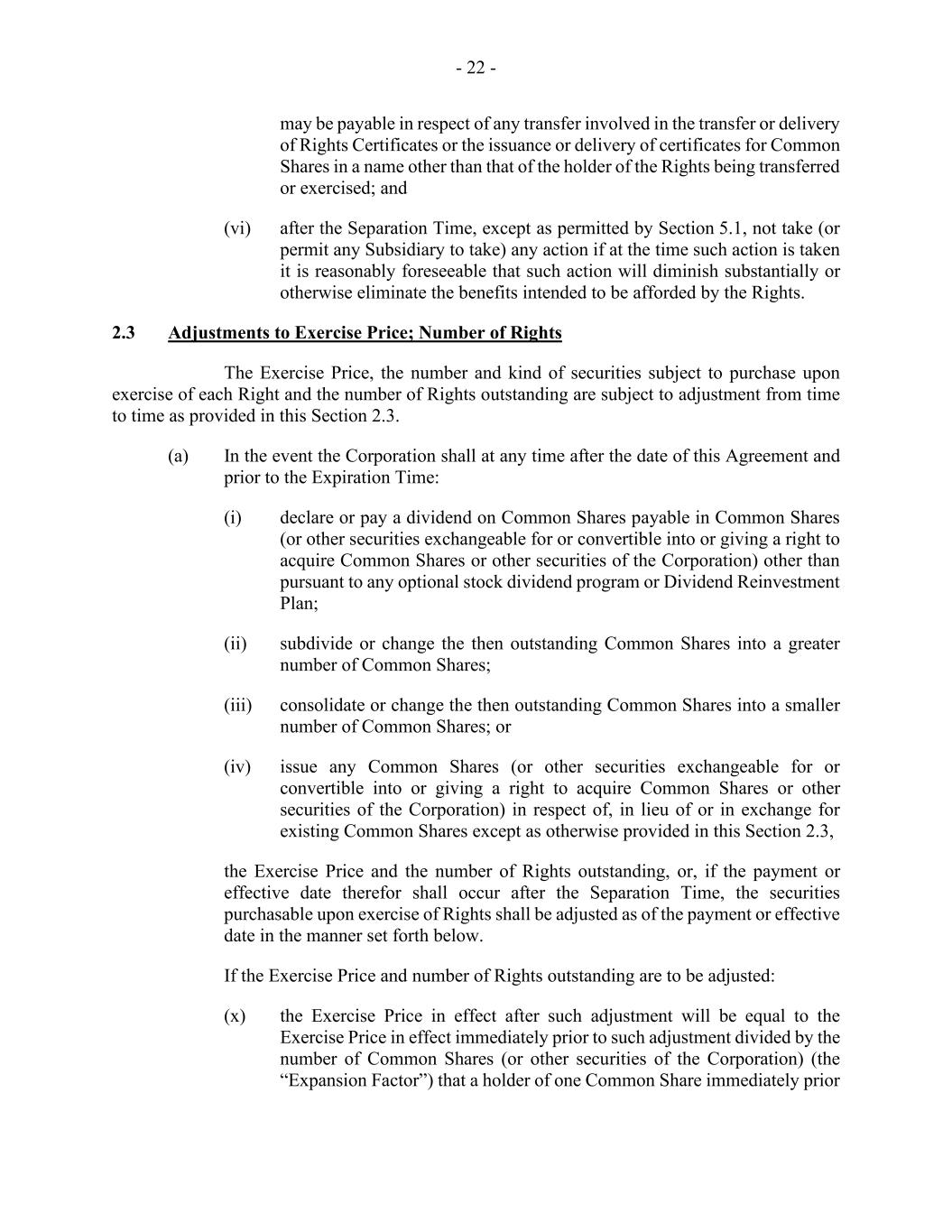 -22-可就转让或交付权利证书或以被转让或行使的权利持有人以外的名义发行或交付普通股证书所涉及的任何转让支付款项;(vi)在分立时间之后,除非第5.1节允许,否则不采取(或允许任何子公司采取)任何行动,前提是在采取此类行动时合理地可以预见此类行动将大幅减少或以其他方式消除权利拟提供的利益。2.3对行权价格的调整;权利数量行权价格、在行使每项权利时须购买的证券数量和种类以及未行使的权利数量将根据本节2.3的规定不时进行调整。(a)如公司须在本协议日期后的任何时间在到期时间之前:(i)宣布或支付以普通股(或其他可交换为或可转换为或赋予收购公司普通股或其他证券的权利的证券)支付的普通股股息,但根据任何可选股票股息计划或股息再投资计划除外;(ii)将当时已发行的普通股细分或更改为更多数量的普通股;(iii)将当时已发行的普通股合并或更改为更少数量的普通股;或(iv)发行任何普通股(或其他可交换证券为或可转换为或赋予收购公司普通股或其他证券的权利)就现有普通股、代替或交换现有普通股、行使价和未行使权利的数量,除非本第2.3条另有规定,或者,如果支付或生效日期应发生在分离时间之后,则在行使权利时可购买的证券应按下述方式自付款或生效日期起调整。如要调整行使价及未行使的权利数目:(x)经该等调整后有效的行使价将等于紧接该等调整前有效的行使价除以紧接前一普通股持有人的普通股(或公司其他证券)数目(“扩展系数”)