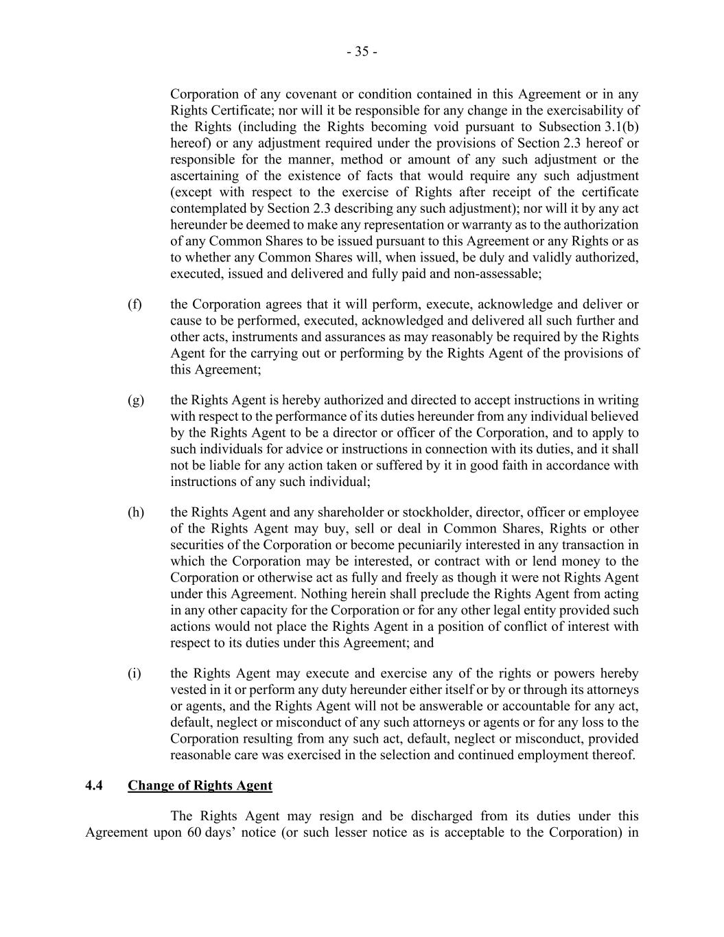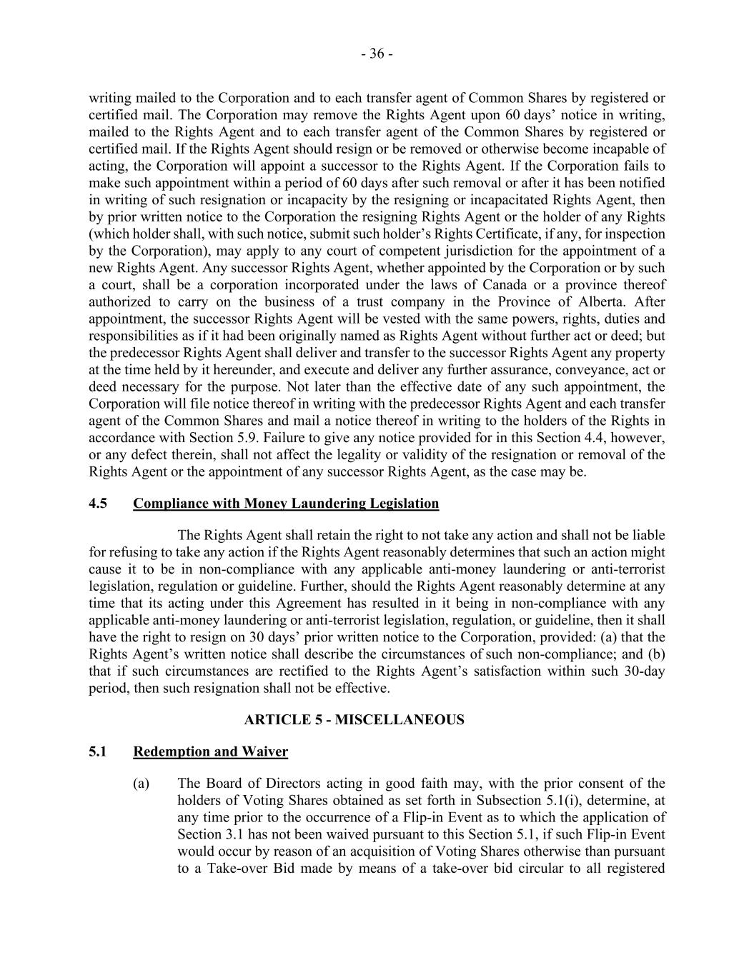 -36-以挂号信或挂号信的方式邮寄给公司和每个普通股转让代理人。公司可以提前60日书面通知解除权利代理人的职务,以挂号信或挂号信方式邮寄给权利代理人和各普通股转让代理人。如果权利代理人应辞职或被免职或以其他方式变得无行为能力,公司将指定权利代理人的继任者。如公司在该等撤职后60天内或在其获辞职或无行为能力的权利代理人以书面通知该辞职或无行为能力后的60天内未能作出该等委任,则藉事先向公司发出书面通知,该辞职权利代理人或任何权利的持有人(该持有人须连同该通知提交该持有人的权利证书(如有的话),以供公司查阅),可向任何有管辖权的法院申请委任新的权利代理人。任何继承权利代理人,不论由公司或该等法院委任,均应为根据加拿大或其所在省的法律成立的公司,获授权在艾伯塔省经营信托公司的业务。指定后,继承权利代理人将被赋予与其最初被指定为权利代理人相同的权力、权利、义务和责任,而无需作出进一步的作为或契据;但前任权利代理人应将其根据本协议持有的当时任何财产交付和转让给继承权利代理人,并执行和交付为此目的所需的任何进一步保证、转易、行为或契据。不迟于任何该等委任的生效日期,公司将向前任权利代理人及每名普通股转让代理人提交书面通知,并根据第5.9条向权利持有人邮寄书面通知。然而,没有发出本条第4.4条所规定的任何通知或其中的任何缺陷,不应影响权利代理人辞职或被免职或任何继承权利代理人的任命(视情况而定)的合法性或有效性。4.5遵守洗钱立法权利代理人应保留不采取任何行动的权利,如果权利代理人合理地确定此类行动可能导致其不遵守任何适用的反洗钱或反恐怖主义立法、法规或准则,则不对拒绝采取任何行动承担责任。此外,如果权利代理人在任何时候合理地确定其根据本协议行事已导致其不遵守任何适用的反洗钱或反恐怖主义立法、法规或指南,则其有权在提前30天向公司发出书面通知时提出辞职,但前提是:(a)权利代理人的书面通知应描述此类不遵守的情况;以及(b)如果此类情况在该30天期限内得到纠正,使权利代理人满意,则该辞职不生效。第5条-杂项5.1赎回和放弃(a)善意行事的董事会可在第5.1(i)款所述获得表决权股份持有人的事先同意下,在翻转事件发生之前的任何时间确定第3.1节的适用未根据本第5.1节被放弃的情况,如果该翻转事件将因收购表决权股份而发生,而不是根据通过向所有已登记的收购要约通知作出的收购要约而发生