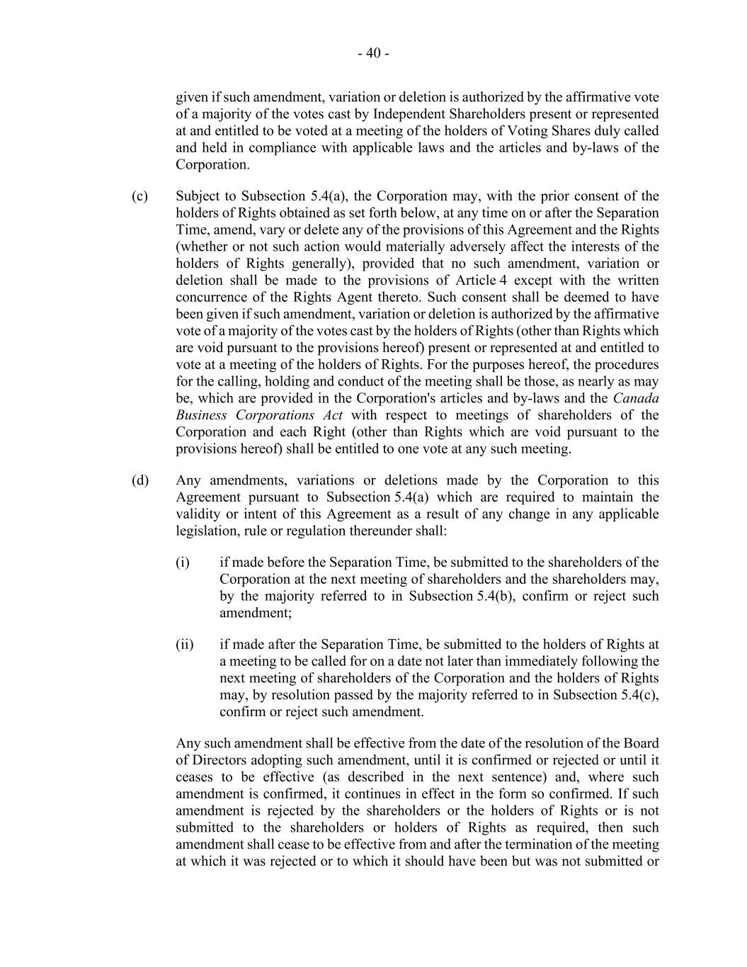 -40-如该等修订、更改或删除获出席或有代表并有权在遵照适用法律及公司章程及附例妥为召集及举行的有表决权股份持有人大会上投票的独立股东所投过半数票的赞成票授权,则给予。(c)在符合第5.4(a)款的规定下,公司可在分离时间当日或之后的任何时间,经下述权利持有人事先同意,修订、更改或删除本协议和权利的任何条款(无论该行动是否会对权利持有人的一般利益产生重大不利影响),但除非获得权利代理人的书面同意,否则不得对第4条的条款作出该等修订、更改或删除。如果权利持有人(根据本协议规定无效的权利除外)出席或代表并有权在权利持有人会议上投票的权利持有人所投的多数票的赞成票授权进行此种修改、变更或删除,则应视为已给予此种同意。就本协议而言,会议的召集、召开和进行的程序应尽可能接近于公司章程和细则以及《加拿大商业公司法》中就公司股东会议规定的程序,并且每项权利(根据本协议的规定无效的权利除外)应有权在任何此类会议上拥有一票表决权。(d)公司依据第5.4(a)款对本协议作出的任何修订、更改或删除,如因根据本协议作出的任何适用立法、规则或条例的任何更改而须维持本协议的有效性或意图,则应:(i)如在分立时间之前作出,则应在下一次股东大会上提交公司股东,而股东可按第5.4(b)款所指的过半数确认或拒绝该等修订;(ii)如在分立时间后作出,在不迟于公司下一次股东大会紧接其后的日期召开的会议上提交权利持有人,权利持有人可藉以第5.4(c)款所提述的多数通过的决议,确认或拒绝该修订。任何该等修订自董事会通过该等修订的决议之日起生效,直至该等修订获得确认或被否决或直至其不再有效(如下一句所述),如该等修订获得确认,则该修订以如此确认的形式继续有效。如该修订被股东或权利持有人否决或未按规定提交股东或权利持有人,则该修订自被否决或本应提交但未提交的会议终止之日起及之后即告失效,或