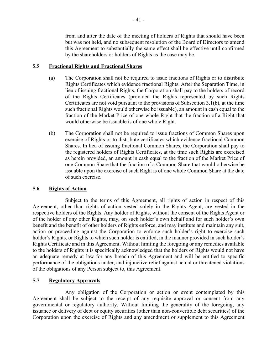 -41-自本应召开但未召开的权利持有人会议之日起及之后,且董事会随后作出的任何修订本协议的决议均不得生效,直至股东或权利持有人(视情况而定)确认。5.5零碎权利和零碎股份(a)公司不得被要求发行零碎权利或分发证明零碎权利的权利证书。在分离时间之后,公司应向权利证书的记录持有人(前提是该等权利证书所代表的权利根据第3.1(b)款的规定不是无效的,在该等零碎权利本来可以发行时)支付一笔现金,金额等于一项完整权利的市场价格的一部分,而该部分原本可以发行的权利是一项完整权利的一部分。(b)公司无须在行使权利时发行零碎普通股,或派发证明零碎普通股的证书。代替发行零碎普通股,公司应在行使本文规定的权利时向权利证书的登记持有人支付一笔现金,金额等于一股普通股的市场价格的零头,否则在行使该权利时可发行的普通股的零头在行使该权利之日为一整股普通股。5.6诉讼权利受制于本协议条款,除完全归属权利代理人的诉讼权利外,与本协议有关的所有诉讼权利均归属于权利的各自持有人。任何权利持有人,未经权利代理人或任何其他权利持有人同意,可代表该持有人自己并为该持有人自己的利益和其他权利持有人的利益强制执行,并可对公司提起和维持任何诉讼、诉讼或程序,以强制执行该持有人以该持有人权利证书和本协议规定的方式行使该持有人权利或该持有人有权享有的权利的权利。在不限制前述规定或权利持有人可获得的任何补救措施的情况下,特别承认权利持有人在法律上不会因任何违反本协议的行为而获得充分的补救,并将有权具体履行本协议项下的义务,以及针对任何受本协议约束的人实际或威胁违反义务的行为获得禁令救济。5.7监管批准公司的任何义务或本协议所设想的行动或事件应以收到任何政府或监管当局的任何必要批准或同意为准。在不限制前述一般性的情况下,公司在行使权利时发行或交付的任何债务或股本证券(不可转换债务证券除外)以及对本协议的任何修订或补充