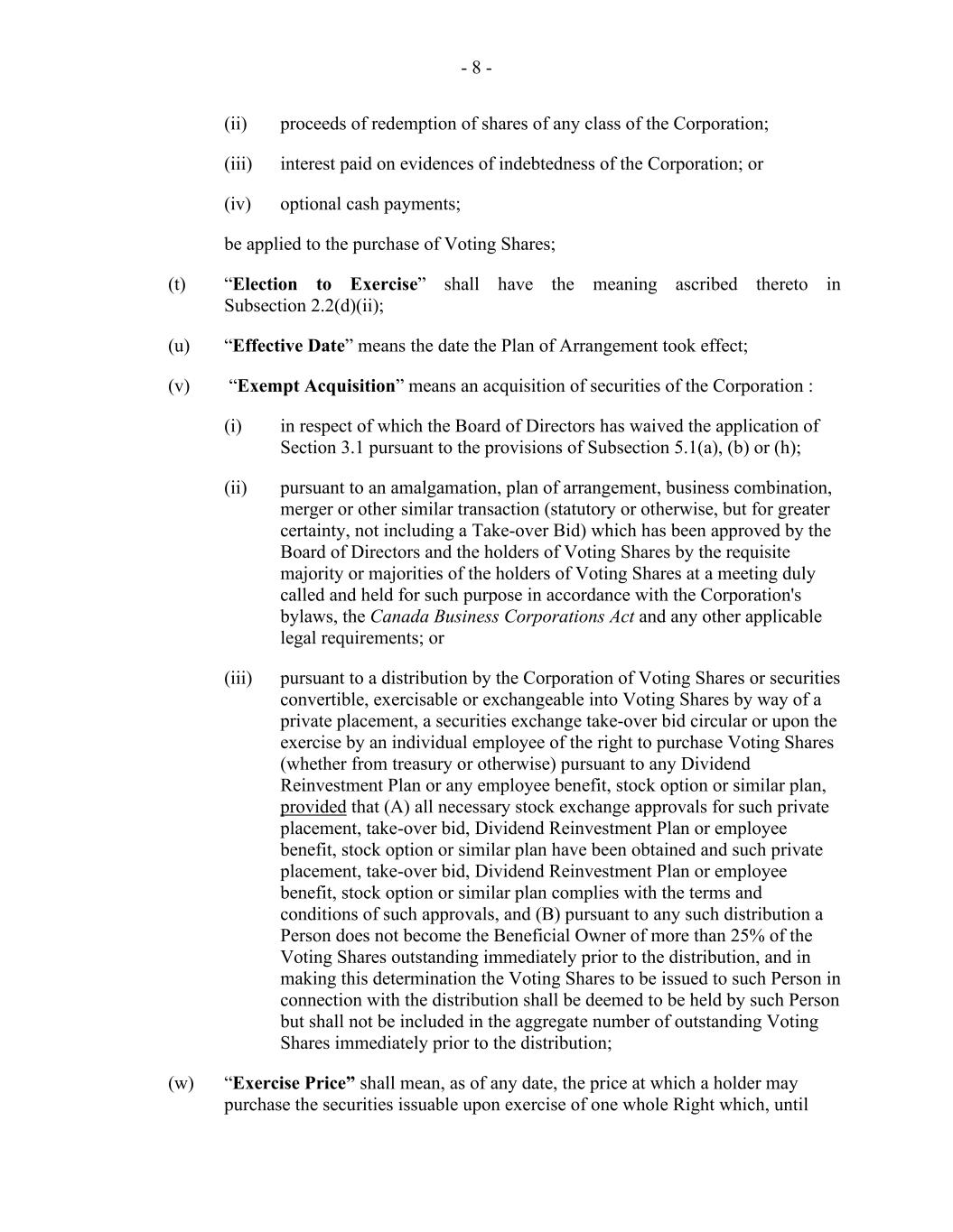 -8-(ii)赎回公司任何类别股份的收益;(iii)就公司负债的证据支付的利息;或(iv)可选择的现金付款;适用于购买有表决权的股份;(t)“选择行使”应具有第2.2(d)(ii)款所赋予的含义;(u)“生效日期”指安排计划生效的日期;(v)“豁免收购”指收购公司的证券:(i)董事会已根据第5.1(a)款的规定放弃适用第3.1节,(b)或(h);(ii)根据合并、安排计划、企业合并、合并或其他类似交易(法定或其他,但为了更大的确定性,不包括收购要约),并经董事会和有表决权股份持有人在根据公司章程、《加拿大商业公司法》和任何其他适用法律要求为此目的正式召集并举行的会议上以必要多数或有表决权股份持有人的多数批准,或(iii)根据公司分配有表决权股份或可转换证券,可通过私募、证券交易所收购要约通函或在雇员个人根据任何股息再投资计划或任何员工福利、股票期权或类似计划行使购买有表决权股份的权利(无论是从库存还是其他方式)时行使或交换为有表决权股份,但前提是(a)已获得该等私募、收购要约、股息再投资计划或员工福利、股票期权或类似计划的所有必要的证券交易所批准,且该等私募、收购要约、股息再投资计划或员工福利,股票期权或类似计划符合该等批准的条款及条件,及(b)根据任何该等分派,一名人士不会成为紧接分派前已发行的有表决权股份的25%以上的实益拥有人,而在作出此决定时,将就分派而向该人士发行的有表决权股份应被视为由该人士持有,但不得计入紧接分派前的已发行有表决权股份总数;(w)“行使价”是指,在任何日期,持有人在行使一项完整权利时可以购买可发行证券的价格,该价格直至