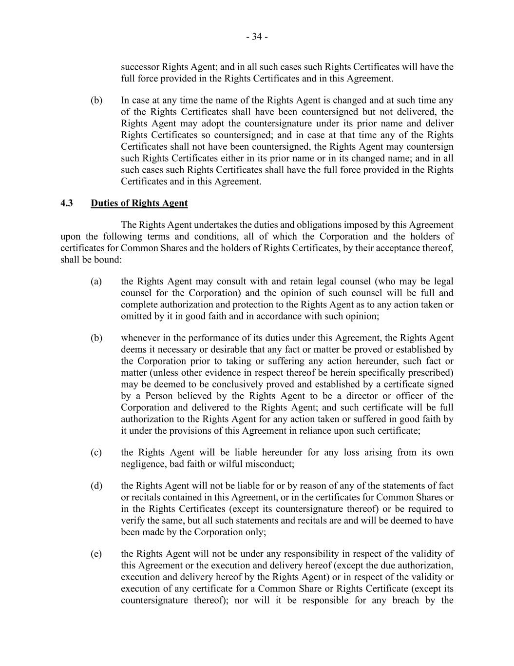 -33-第4条-权利代理人4.1一般(a)公司特此指定权利代理人根据本协议的条款和条件作为公司和权利持有人的代理人,权利代理人特此接受该任命。公司可不时委任其认为有需要或合宜的共同权利代理人(“共同权利代理人”)。如果公司指定一名或多名共同权利代理人,权利代理人和共同权利代理人各自的职责由公司决定。公司同意支付权利代理人履行本协议义务的所有合理费用和开支。公司还同意就权利代理人在接受和管理本协议时所做或不做的任何事情,就权利代理人与接受和管理本协议有关的任何作为或不作为而招致的任何损失、责任或费用,对权利代理人进行赔偿,并使其免受损害,包括针对任何责任主张进行辩护的费用和费用,该赔偿权利将在本协议终止后继续有效。(b)权利代理人应受到保护,并不因其依赖任何普通股证书、权利证书、公司其他证券证书、转让或转让文书、授权委托书、背书、誓章、信函、通知、指示、同意书、证书、声明或其认为是真实的并将由适当的人签署、签立并在必要时经核实或承认的其他纸张或文件而就其管理本协议而采取、遭受或遗漏的任何行动承担或就其承担任何责任。4.2权利代理人的合并、合并或合并或变更名称(a)权利代理人或任何继承权利代理人可能合并或合并的任何公司,或权利代理人或任何继承权利代理人作为一方的任何合并、合并、法定安排或合并产生的任何公司,或继承权利代理人或任何继承权利代理人的股东或股东服务业务的任何公司,将是本协议项下权利代理人的继承者,而无需签署或提交任何文件或本协议任何一方的任何进一步行为,前提是该公司将有资格根据本协议第4.4节的规定被任命为继承权利代理人。在该继承权利代理人接替本协议所设代理机构时,任何继承权利代理人可以采用被继承权利代理人的会签方式,交付如此会签的权利凭证;而在该继承权利代理人届时任何权利未被会签的情况下,任何继承权利代理人可以被继承权利代理人的名义或以被继承权利代理人的名义会签该等权利凭证