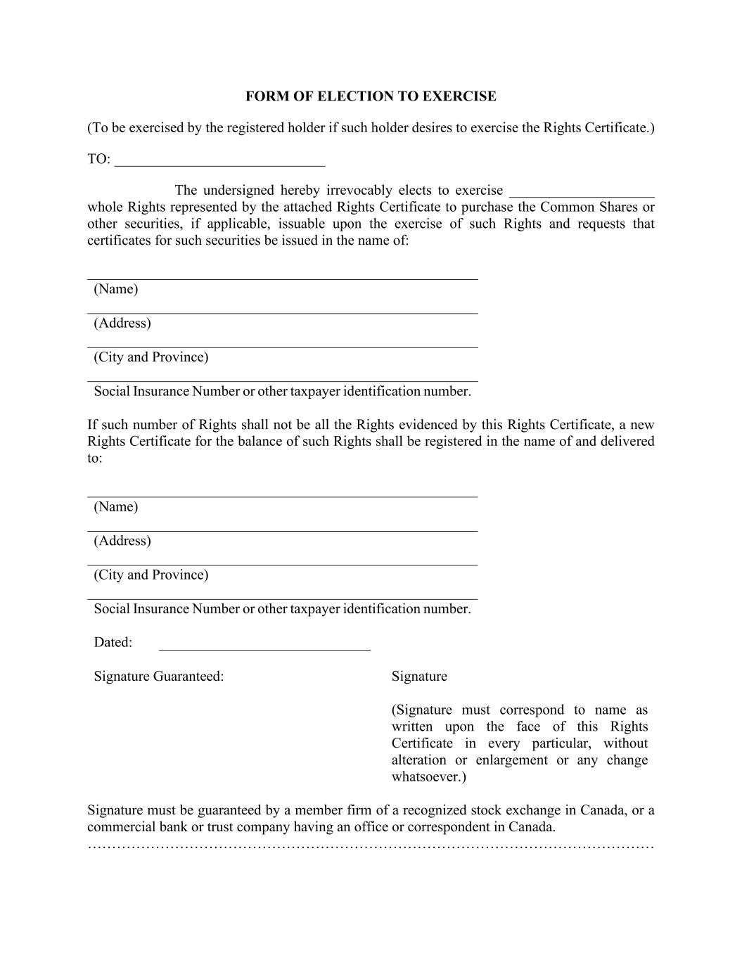 选择行使的形式(由登记持有人行使,如果该持有人希望行使权利证书。)至:_________________________________以下签署人在此不可撤销地选择行使所附权利证书所代表的_____________________的全部权利,以购买在行使该权利时可发行的普通股或其他证券(如适用),并要求以(姓名)(地址)(市、省)社会保险号或其他纳税人识别号的名义发行该等证券的证书。该等权利数不应为本权利证书所证明的全部权利的,应以(姓名)(地址)(市、省)社会保险号或其他纳税人识别号的名义登记并交付该等权利余额的新权利证书。Dated:Signature Guaranteed:Signature(Signature must correspond to name as written on the face of this rights certificate in every particular,without changes or enlargement or any change.)Signature must be guaranteed by a member firm of a recognized stock exchange in Canada,or a commercial bank or trust company ha………………………………………………………………………………………………………