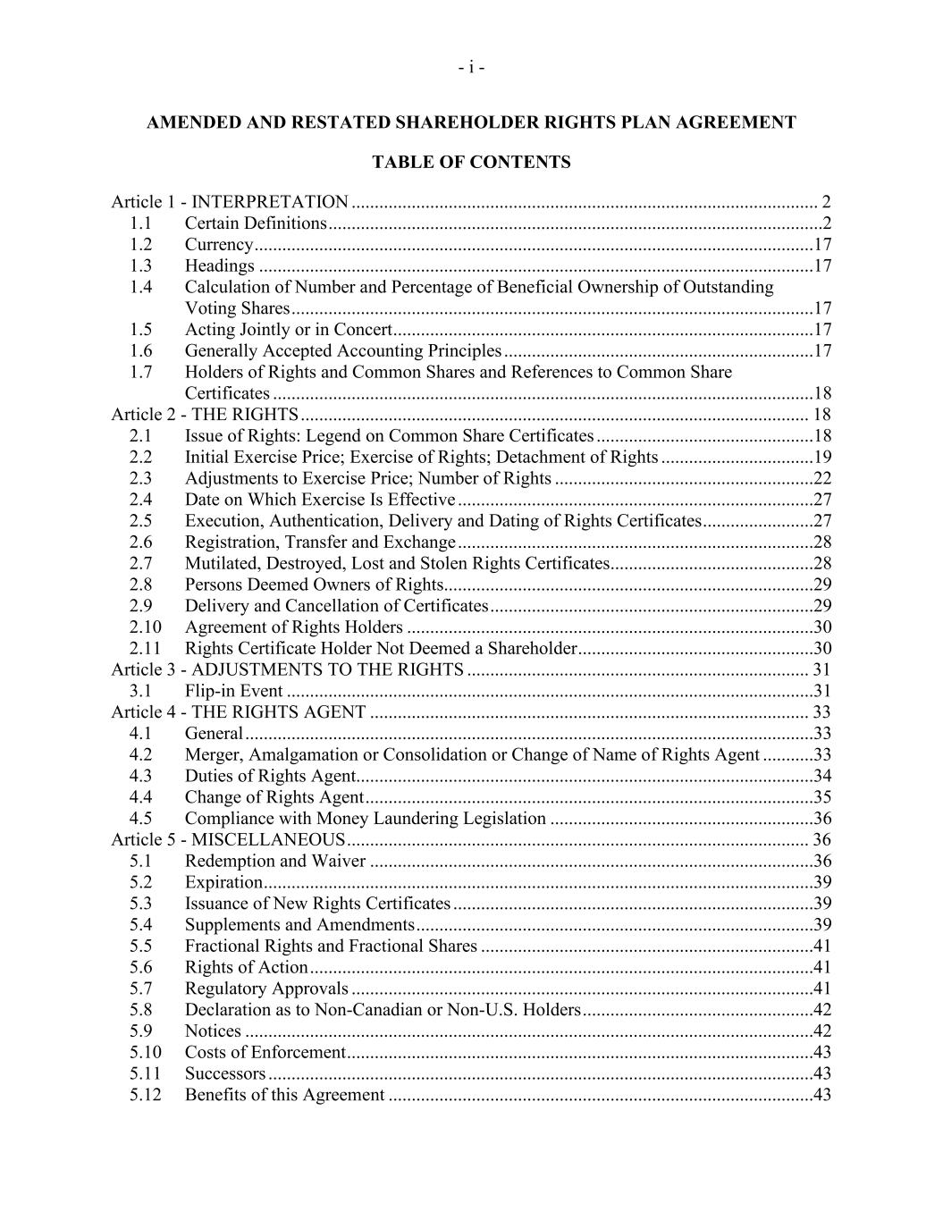-i-经修订和重述的股东权利计划协议目录第1条-解释......................................................................................................... 21.1某些定义......................................................................................... 21.2货币......................................................................................................................17 1.3标题......................................................................................17 1.4已发行有表决权股份实益拥有的数量和百分比的计算....................................................................................17 1.5共同或一致行动....................................................17 1.6公认会计原则...................................................................17 1.7权利和普通股持有人及对普通股权证的提述.....................................................................................................18第二条-权利......................................................................................................18 2.1发行权利:普通股权证图例.....................................................18 2.2初始行权价格;行使权利;权利分离.....................................19 2.3调整行权价格;权利数量.....................................................22 2.4行权生效日期.....................................................................27 2.5权利证书的执行、认证、交付和日期....................27 2.6登记、转让和交换....................................................................28 2.7残废、销毁,权利证书遗失和被盗....................................................28 2.8人视为权利所有人................................................................................29 2.9证书的交付和注销................................................................................29 2.10权利持有人的约定................................................................................30 2.11权利证书持有人不视为股东....................................................30第三条-权利的调整....................................................................31 3.1翻转事件....................................................................................................31第四条-权利代理人................................................................................33 4.1一般情况....................................................................................33 4.2合并, 合并或合并或更改权利代理人的名称...................33 4.3权利代理人的职责...................................................................................34 4.4权利代理人的变更...................................................................................................35 4.5遵守洗钱立法.......................................................36第5条-杂项.......................................................................................................36 5.1赎回和放弃....................................................................................3 65.2到期....................................................................................................3 95.3发行新的权利证书....................................................................................3 95.4补充和修订...................................................................................................3 95.5零碎权利和零碎股份....................................................................4 15.6诉权....................................................................................................4 15.7监管批准....................................................................................................4 15.8关于非加拿大或非美国持有人的声明....................................................42............................................................................................43