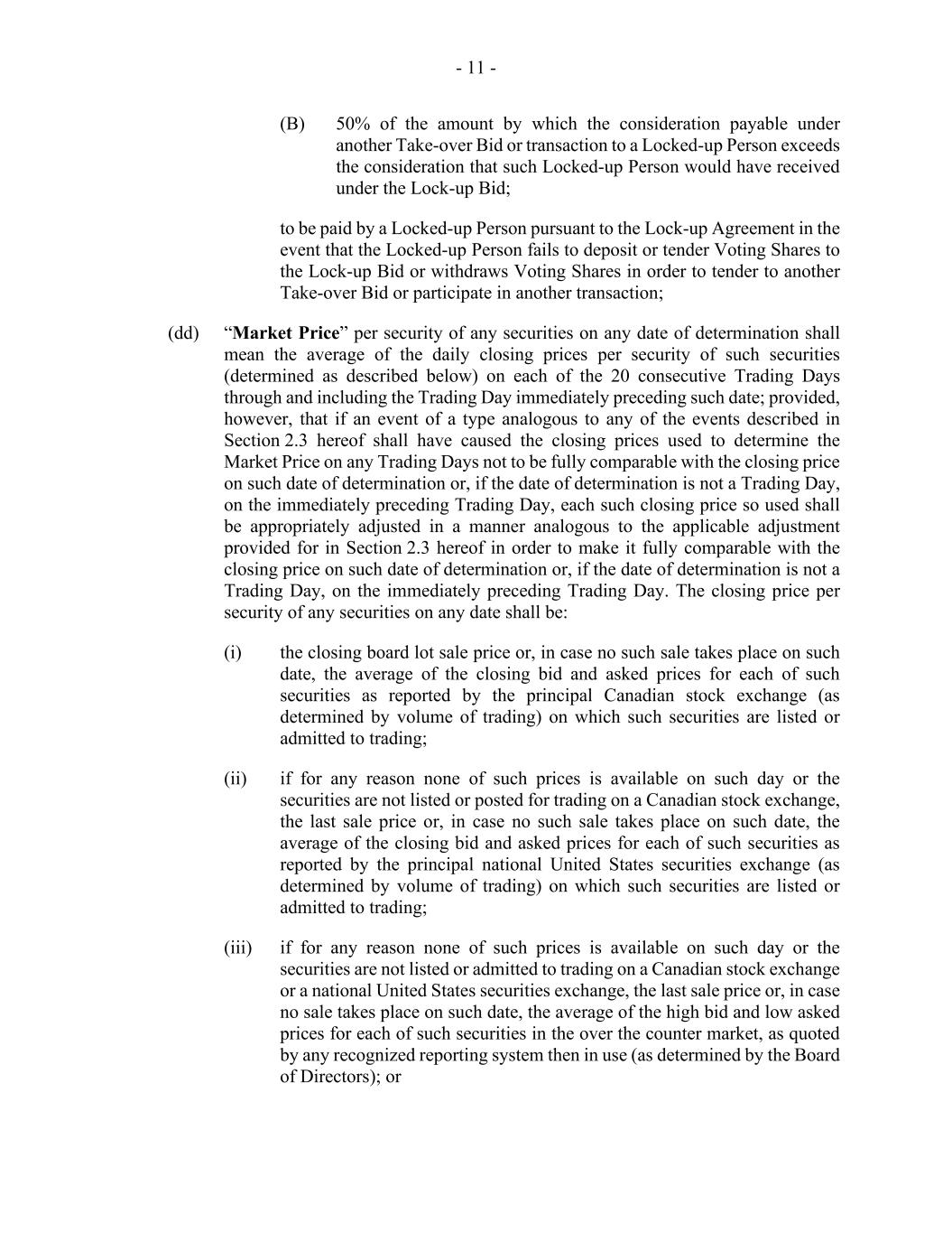 -11-(b)根据另一项收购要约或交易应付予锁定人士的代价超过该锁定人士根据锁定要约本应收取的代价的金额的50%;在发生被锁定人未能将有表决权的股份存入或投标至锁定出价或撤回有表决权的股份,以便投标至另一收购要约或参与另一交易;(dd)任何证券在任何确定日期的每只证券的“市价”,系指该等证券的每只证券在连续20个交易日中的每一个交易日(按下述方式确定)的每日收盘价的平均值,直至并包括紧接该日期之前的交易日;但前提是,如发生类似于本协议第2.3节所述任何事件的类型的事件,应已导致用于确定任何交易日市场价格的收盘价与该确定日的收盘价不完全可比,或如确定日不是交易日,则在紧接的前一个交易日,如此使用的每一该等收市价,均须以类似于本条例第2.3节规定的适用调整的方式作出适当调整,以使其与该确定日期的收市价完全可比,如该确定日期并非交易日,则与紧接的前一交易日的收市价完全可比。任何证券在任何日期的每份证券的收盘价应为:(i)收市一手买卖价格,或如在该日期没有发生此类出售,则为此类证券上市或获准交易的主要加拿大证券交易所(按交易量确定)所报告的每份此类证券的收盘出价和要价的平均值;(ii)如果由于任何原因,在该日期没有任何此类价格可用,或这些证券未在加拿大证券交易所上市或挂牌交易,最后出售价格,或在该日期没有发生此种出售的情况下,该等证券上市或获准交易的主要美国国家证券交易所(按交易量确定)所报告的每一种此类证券的收盘出价和要价的平均值;(iii)如果由于任何原因在该日期没有任何此类价格,或该证券未在加拿大证券交易所或美国国家证券交易所上市或获准交易,则最后出售价格或,如果在该日期没有发生出售,则由当时使用的任何公认报告系统(由董事会确定)所报的场外市场上每一种此类证券的高出价和低要价的平均值;或者