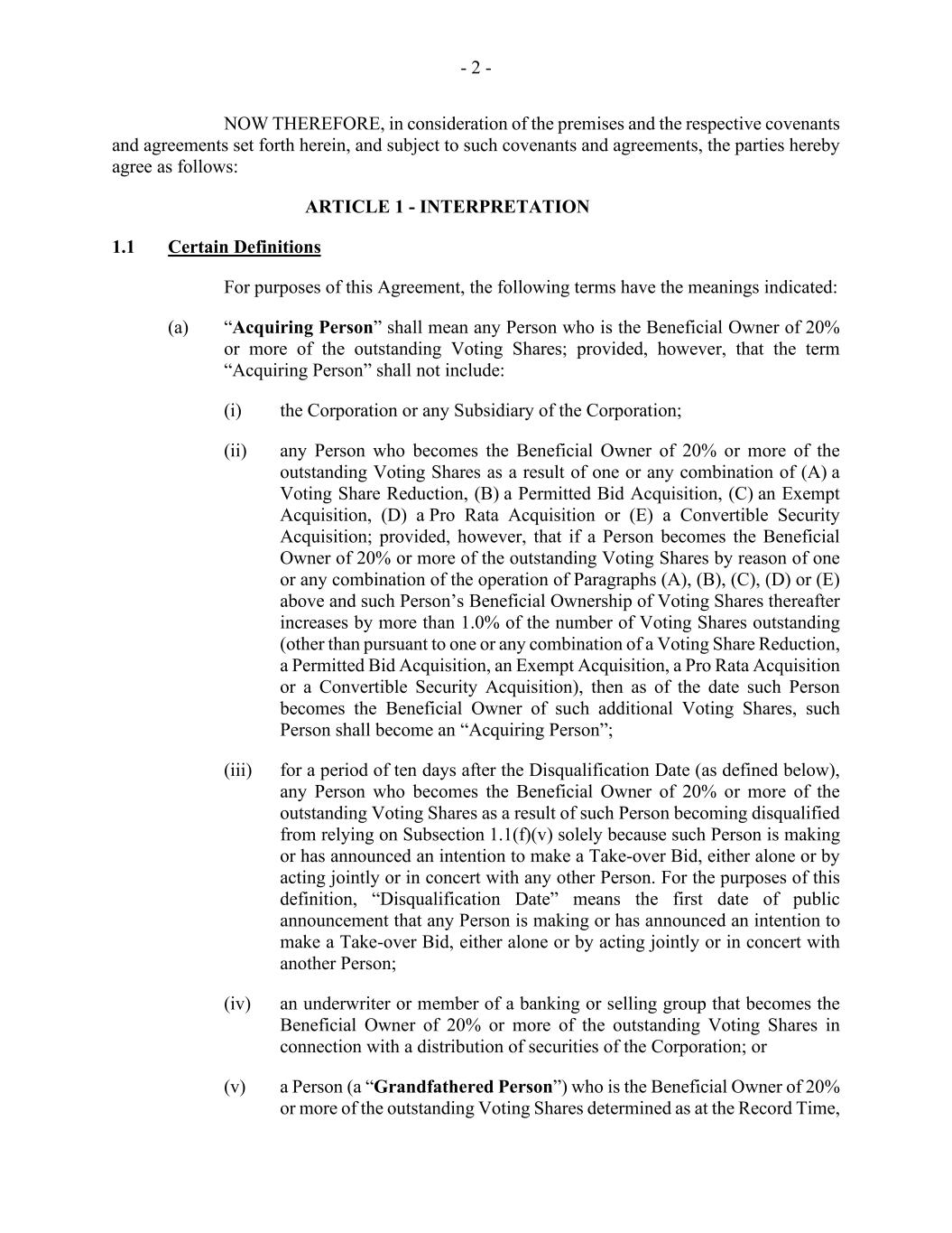-2-因此,考虑到本协议所载的前提和各自的契诺和协议,并在遵守该等契诺和协议的前提下,双方特此约定如下:第1条-解释1.1本协议的某些定义,以下术语具有所示含义:(a)“收购人”是指任何拥有20%或更多已发行有表决权股份的实益拥有人的人;但前提是,“收购人”一词不应包括:(i)公司或公司的任何附属公司;(ii)因(a)有表决权的股份减少、(b)许可的要约收购、(c)豁免收购、(d)按比例收购或(e)可转换证券收购的一项或任何组合而成为已发行有表决权股份20%或以上的实益拥有人的任何人;但前提是,如某人因上述(a)、(b)、(c)、(d)或(e)段的一项或任何组合的运作而成为已发行有表决权股份的20%或以上的实益拥有人,而该人其后对有表决权股份的实益拥有权增加超过已发行有表决权股份数目的1.0%(根据有表决权股份减少、许可的出价收购、豁免收购、按比例收购或可转换证券收购的一项或任何组合除外),则自该人成为该等额外有投票权股份的实益拥有人之日起,该人应成为“收购人”;(iii)在取消资格日期(定义见下文)后的十天内,任何成为已发行有投票权股份20%或以上的实益拥有人的人仅因该人正在单独或通过与任何其他人共同或一致行动的方式作出或已宣布有意作出收购要约而因该人丧失依赖第1.1(f)(v)款的资格。就本定义而言,“取消资格日期”指任何人正在作出或已宣布有意作出收购要约的第一个公开公告日期,单独或通过与另一人共同或一致行动;(iv)就公司的证券分销而成为已发行有表决权股份20%或以上的实益拥有人的银行或销售集团的承销商或成员;或(v)在记录时间已确定的已发行有表决权股份20%或以上的实益拥有人的人(“祖父人”),
