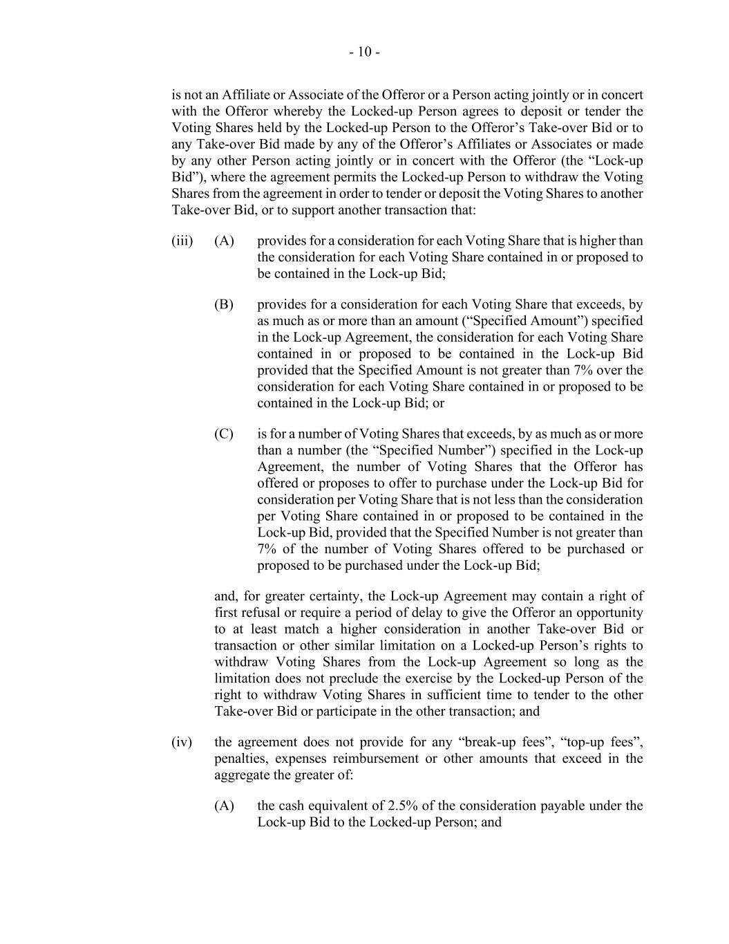-10-并非要约人的联属公司或联系人或与要约人共同或一致行动的人,据此,禁售人同意将禁售人所持有的有表决权股份存入或投标要约人的收购要约或任何要约人的联属公司或联系人作出的任何收购要约或由与要约人共同或一致行动的任何其他人作出的任何收购要约(“禁售要约”),凡协议允许锁定人士从协议中撤回有表决权的股份,以便将有表决权的股份提交或存入另一收购要约,或支持另一项交易:(iii)(a)就每一有表决权股份订定的代价高于锁定要约所载或拟载于该锁定要约的每一有表决权股份的代价;(b)就每一有表决权股份订定的代价超过、最多或超过锁定协议规定的金额(“指定金额”),锁定出价所载或拟载的每一有表决权股份的代价,条件是指明金额不超过锁定出价所载或拟载的每一有表决权股份的代价的7%;或(c)为超过、最多或超过锁定协议规定的数目(“指明数目”)的若干有表决权股份,要约人根据锁定要约已要约或建议要约购买的有表决权股份的数目,以供每股有表决权股份的代价不少于锁定要约所载或建议包含在锁定要约中的每股有表决权股份的代价,但条件是指明数目不多于根据锁定要约所要约购买或建议购买的有表决权股份数目的7%;及为更大的确定性,锁定协议可能包含优先购买权或要求一段时间的延迟,以使要约人有机会在另一次收购要约或交易中至少匹配更高的对价或对锁定人从锁定协议中撤回表决权股份的权利的其他类似限制,只要该限制不排除锁定人在足够时间内行使撤回表决权股份的权利以向另一次收购要约或参与另一次交易;及(iv)该协议并无规定任何“分手费”、“补足费”、罚款、费用补偿或其他合计超过以下两者中较大者的金额:(a)根据锁定出价应付予被锁定人的代价的2.5%的现金等值;及