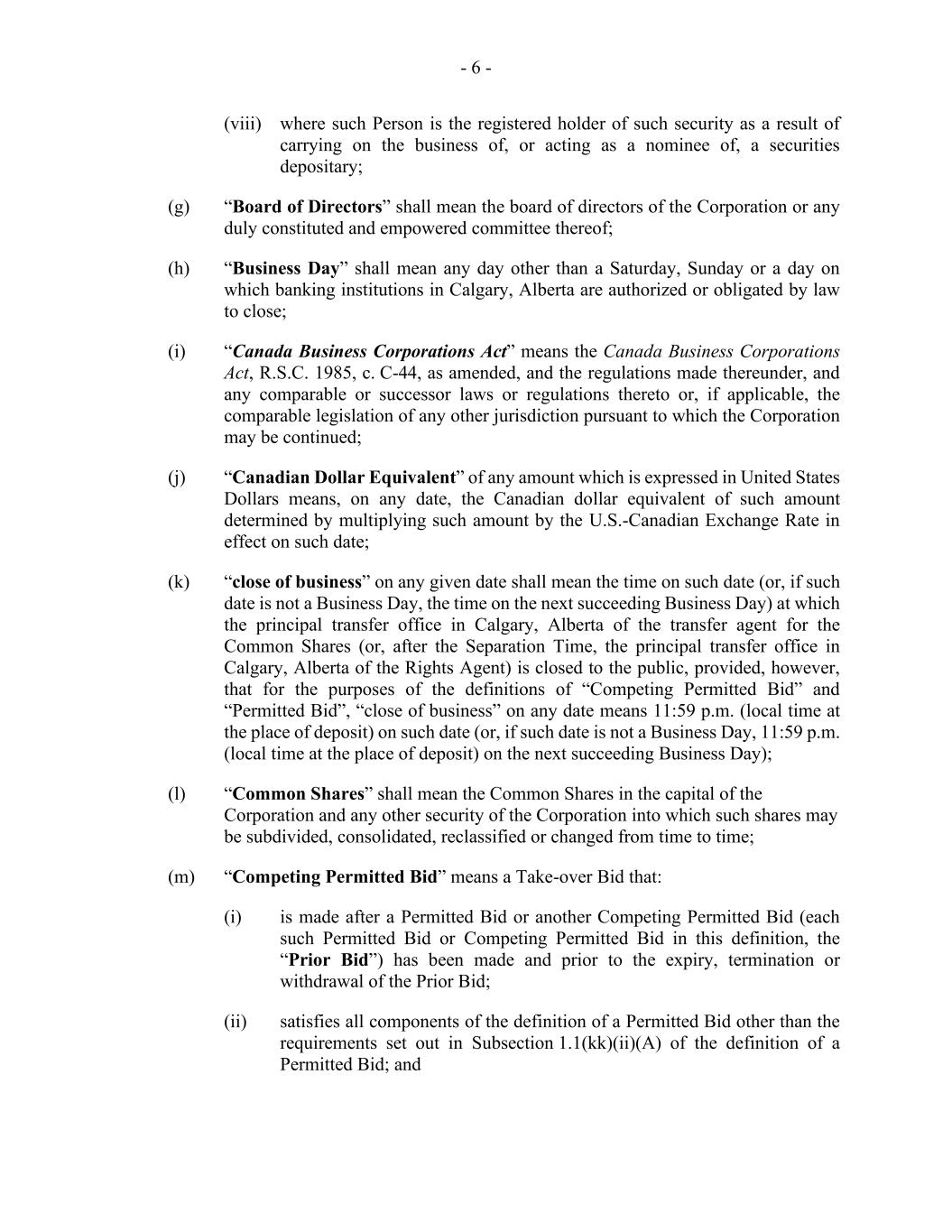 -6-(viii)如该人因经营证券存管人的业务或作为证券存管人的代名人而成为该证券的登记持有人;(g)“董事会”系指公司的董事会或其任何正式组成并获授权的委员会;(h)“营业日”系指除星期六、星期日或法律授权或有义务关闭阿尔伯塔省卡尔加里的银行机构的任何一天以外的任何一天;(i)“加拿大商业公司法”系指加拿大商业公司法,R.S.C. 1985,约C-44,经修订的条例,以及根据该条例订立的条例,以及与该条例有关的任何可比较或继承的法律或条例,或(如适用)任何其他法域的可比较立法,公司可据此继续运作;(j)以美元表示的任何金额的“等值加元”是指在任何日期,通过将该金额乘以该日期有效的美国-加拿大汇率而确定的该金额的等值加元;(k)任何特定日期的“营业结束”是指该日期的时间(或者,如果该日期不是营业日,下一个营业日的时间)普通股股份转让代理人在艾伯塔省卡尔加里的主要转让办事处(或在分立时间后,权利代理人在艾伯塔省卡尔加里的主要转让办事处)对公众关闭,但条件是,就“竞争性许可出价”和“许可出价”的定义而言,任何日期的“营业结束”是指该日期(或,如果该日期不是营业日,(l)“普通股”是指公司资本中的普通股,以及该等股份可能不时被拆细、合并、重新分类或变更的公司任何其他证券;(m)“竞合许可出价”是指:(i)在一个许可出价或另一个竞合许可出价(本定义中的每一个该等许可出价或竞合许可出价,即“先前出价”)已作出且在期满之前作出的收购出价,终止或撤回先前投标;(ii)满足许可投标定义的所有组成部分,但许可投标定义第1.1(kk)(ii)(a)小节规定的要求除外;和