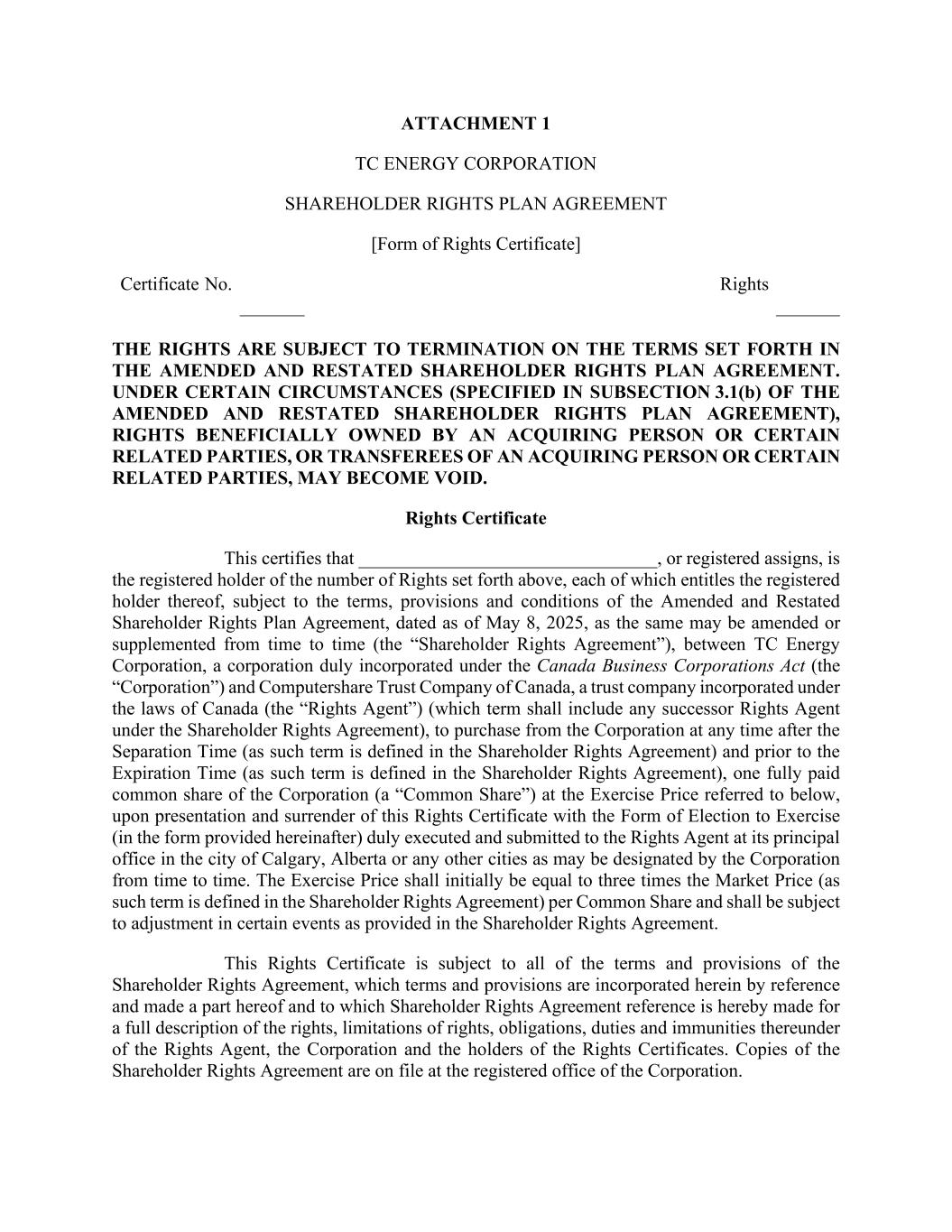 附件1 TC Energy Corporation股东权利计划协议[权利证书形式]证书编号权利根据经修订及重述的股东权利计划协议所载的条款,该等权利须予终止。在某些情况下(详见经修订和重述的股东权利计划协议第3.1(b)款),收购人或某些关联方或收购人或某些关联方的受让人实益拥有的权利可能变得无效。权利证明这证明__________________________________或注册受让人是上述权利数量的登记持有人,每一项权利均赋予登记持有人权利的权利,但须遵守日期为2025年5月8日的经修订和重述的股东权利计划协议的条款、规定和条件(该协议可能会不时修订或补充)(“股东权利协议”),由根据《加拿大商业公司法》正式注册成立的公司(“公司”)与加拿大ComputerShare Trust Company,根据加拿大法律成立的信托公司(“权利代理人”)(该术语应包括股东权利协议项下的任何继承权利代理人),在分立时间之后(该术语在股东权利协议中定义)和到期时间(该术语在股东权利协议中定义)之前的任何时间,以下文提及的行使价向公司购买一股已缴足股款的普通股(“普通股”),在出示并交出本权利证书时,连同正式签立并提交给权利代理人在其位于卡尔加里市、艾伯塔省或公司可能不时指定的任何其他城市的主要办事处的选择行使表格(以下提供的表格)。行权价格最初应等于每股普通股市场价格(如股东权利协议中所定义的术语)的三倍,并应根据股东权利协议的规定在某些事件中进行调整。本权利证书受《股东权利协议》的所有条款和规定的约束,这些条款和规定以引用方式并入本文并成为本文的一部分,《股东权利协议》特此引用,以全面描述权利代理人、公司和权利证书持有人在其下的权利、权利限制、义务、义务和豁免。股东权利协议的副本已在公司注册办事处存档。