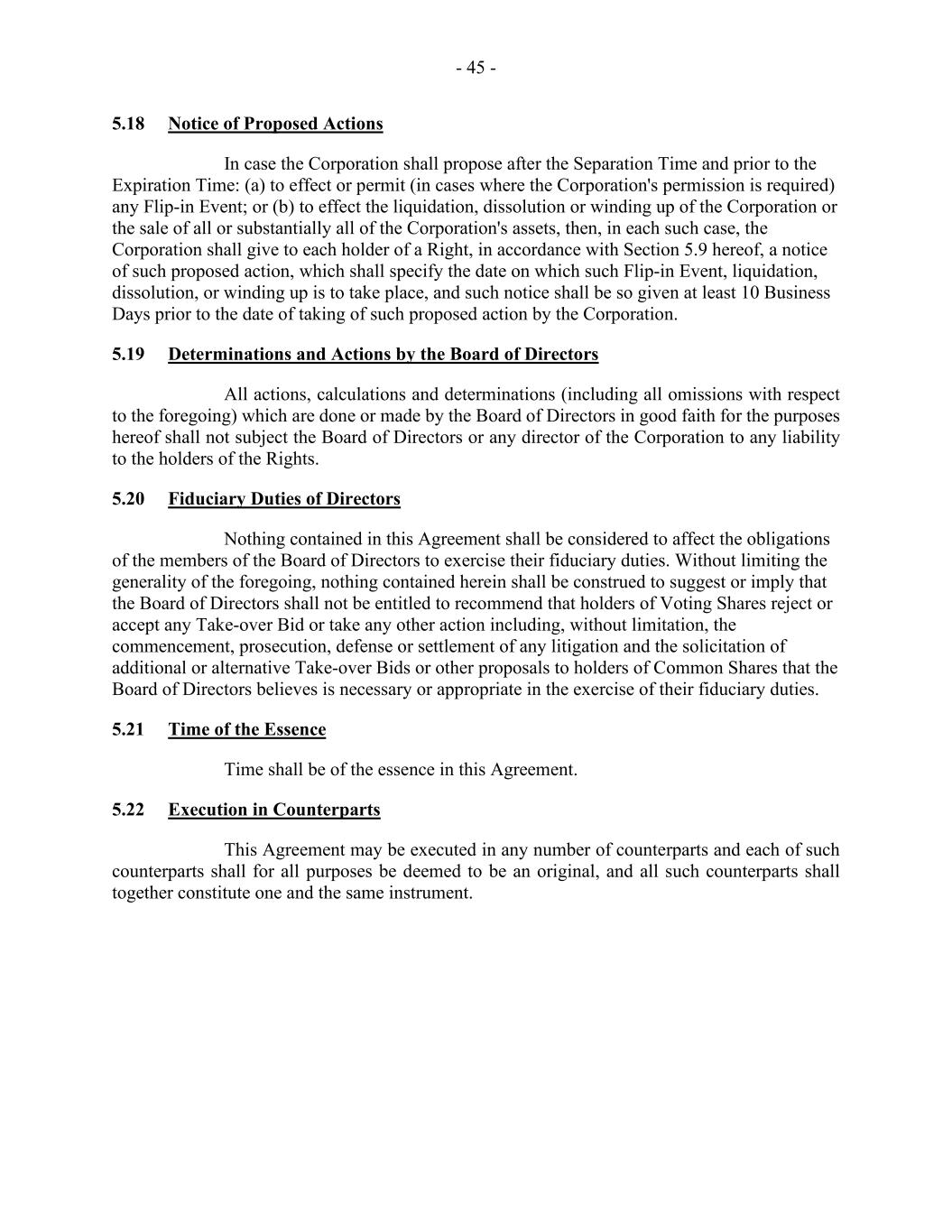 -45-5.18拟议行动通知,如公司应在分立时间之后和期满时间之前提出:(a)实施或允许(在需要公司许可的情况下)任何翻转事件;或(b)实施公司的清算、解散或清盘或出售公司的全部或基本全部资产,则在每一此种情况下,公司应根据本协议第5.9条向权利的每一持有人发出此类拟议行动的通知,该通知须指明发生该等翻转事件、清盘、解散或清盘的日期,而该通知须在公司采取该等建议行动的日期前至少10个营业日发出。5.19董事会的决定和行动董事会为本协议的目的善意作出或作出的所有行动、计算和决定(包括与上述有关的所有遗漏),均不得使董事会或公司的任何董事对权利持有人承担任何法律责任。5.20董事的受托责任本协议中的任何内容均不得被视为影响董事会成员行使受托责任的义务。在不限制前述内容的概括性的情况下,本文所载的任何内容均不得解释为暗示或暗示董事会无权建议有表决权的股份持有人拒绝或接受任何收购要约或采取任何其他行动,包括但不限于启动、起诉、抗辩或解决任何诉讼,以及向普通股持有人征集董事会认为在行使其受托责任时必要或适当的额外或替代收购要约或其他提议。5.21精华时间应为本协议中的精华。5.22在对应方执行本协议可在任意数目的对应方执行,每一对应方就所有目的而言均应被视为原件,所有这些对应方应共同构成一份相同的文书。