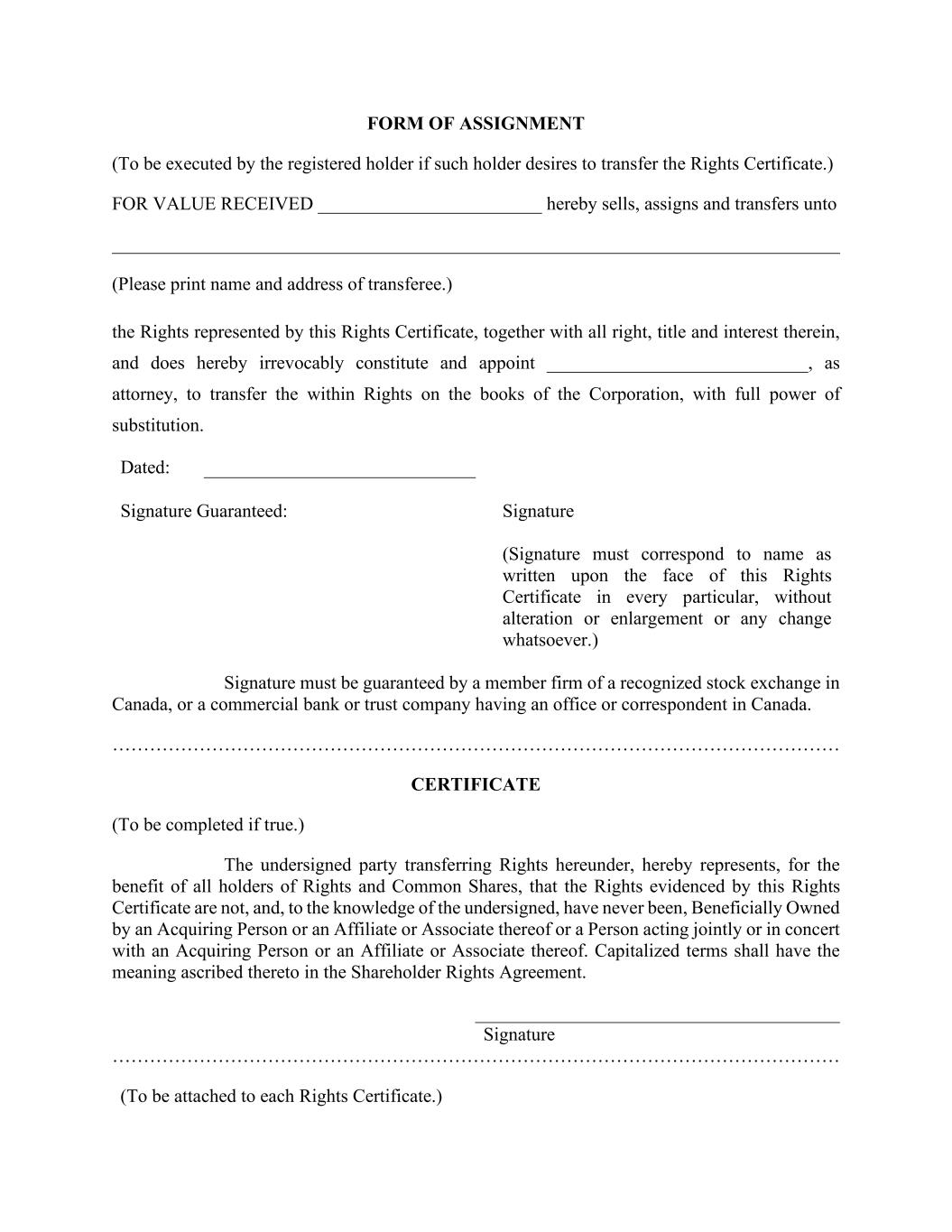 转让形式(登记持有人欲转让权利证书的,由登记持有人执行。)收到的价值__________________________________________________________________________________________________________(请打印受让人姓名、地址。)本权利证书所代表的权利,连同其中的所有权利、所有权和权益,在此不可撤销地构成并指定__________Dated:Signature Guaranteed:Signature(Signature must correspond to name as written on the face of this Rights Certificate in every particular,without changes or enlargement or any change.)Signature must be guaranteed by a member firm of a recognized stock exchange in Canada,or a commercial bank or trust company has an office or responent in Canada。……………………………………………………………………………………………………………………………………………………………………………………………………………………………………………………………………………………………………………………………………………………………………………………………………………………………………………………………………………………………………………………………………………………………………………………………………………………………………………………………………………………………………………………………………………………………………………………………………………………………………………………………………………………………………………………………………………………………………………………………………………………………………………………………………………………大写术语应具有股东权利协议中赋予的含义。签字…………………………………………………………………………………………………………………………………………(附于每份权利证书。)