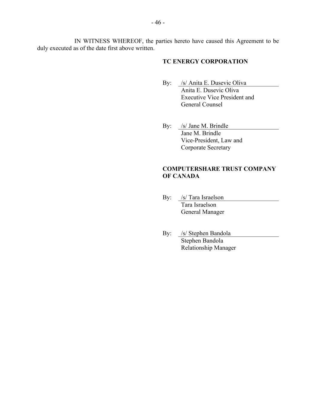 -46-作为证明,本协议各方已促使本协议在上述第一个书面日期正式签署。TC Energy CORPORATION by:/s/Anita E. Dusevic Oliva Anita E. Dusevic Oliva执行副总裁兼总法律顾问by:/s/Jane M. Brindle Jane M. Brindle加拿大计算机共享信托公司副总裁、法律和公司秘书by:/s/tara Israelson Tara Israelson总经理by:/s/Stephen Bandola Stephen Bandola关系经理