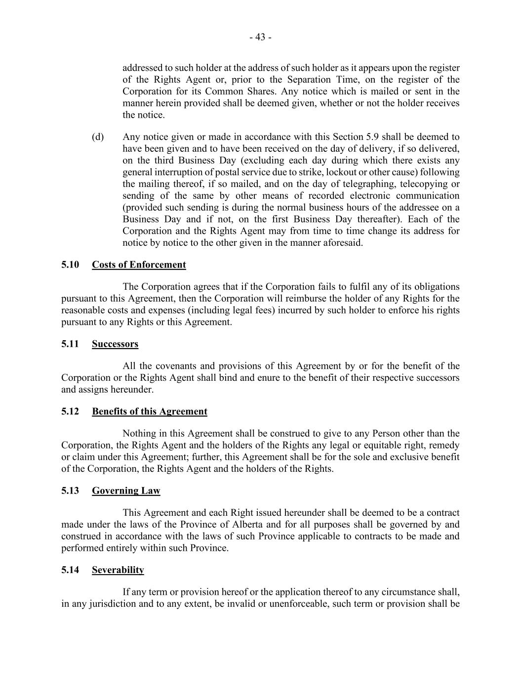 -43-以权利代理人名册上出现的持有人的地址或在分立时间之前出现在公司的普通股名册上的该持有人的地址寄给该持有人。以此处提供的方式邮寄或发送的任何通知,无论持有人是否收到通知,均应视为已发出。(d)按照本条第5.9条发出或作出的任何通知,须当作已于交付当日(如如此交付)、在该通知发出后的第三个营业日(不包括因罢工、停运或其他原因而导致邮政服务普遍中断的每一天)及在电报发出当日发出或已收到,电传或以其他记录电子通信方式发送(前提是此种发送是在收件人某一营业日的正常营业时间内,如果不是,则在其后的第一个营业日)。公司及权利代理人各自可不时更改其以上述方式给予另一方的通知通知地址。5.10强制执行费用公司同意,如果公司未能根据本协议履行其任何义务,那么公司将向任何权利持有人偿还该持有人为根据任何权利或本协议强制执行其权利而产生的合理费用和开支(包括法律费用)。5.11继承人本协议由公司或权利代理人或为其利益而订立的所有契诺和条款,均对其各自的继承人和受让人在本协议项下的利益具有约束力和授权。5.12本协议的利益本协议中的任何内容均不得解释为给予除公司、权利代理人和权利持有人以外的任何人根据本协议享有的任何合法或衡平法权利、补救或索赔;此外,本协议应为公司、权利代理人和权利持有人的唯一和专属利益。5.13管辖法律本协议和根据本协议签发的每项权利应被视为根据艾伯塔省法律订立的合同,就所有目的而言,应受适用于完全在该省内订立和履行的合同的该省法律管辖并按其解释。5.14可处置性如果本协议的任何条款或规定或其对任何情况的适用在任何司法管辖区和在任何程度上无效或不可执行,则该条款或规定应