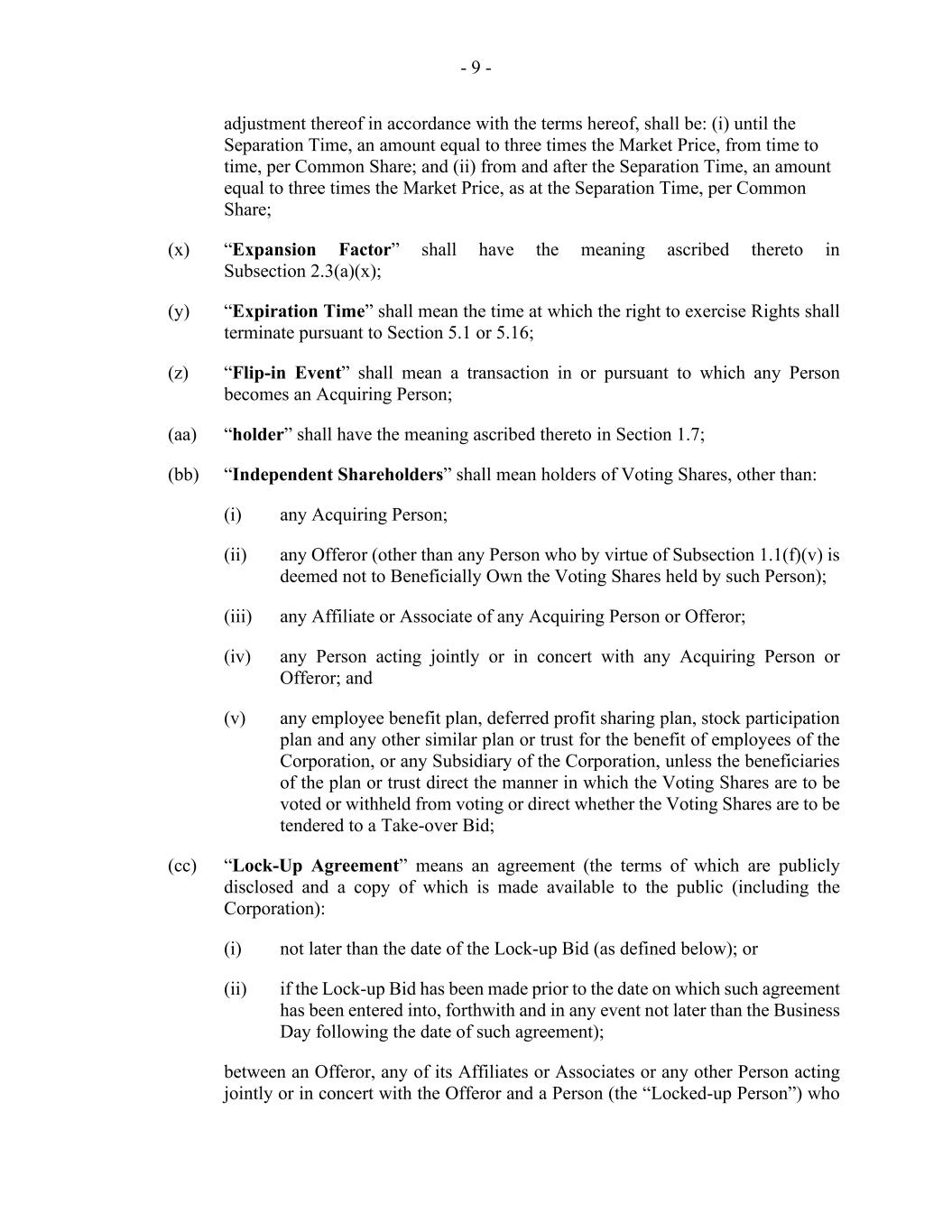 -9-根据本协议条款进行的调整,应为:(i)直至分立时,每一普通股不时的相当于市场价格三倍的金额;(ii)自分立时起及之后,相当于分立时市场价格三倍的金额,每普通股;(x)“扩张因素”应具有第2.3(a)(x)款所赋予的含义;(y)“到期时间”系指根据第5.1节或第5.16节行使权利的权利终止的时间;(z)“翻转事件”系指任何人在其中或根据该交易成为收购人;(aa)“持有人”应具有第1.7节所赋予的含义;(bb)“独立股东”系指有表决权的股份持有人,(i)任何收购人;(ii)任何要约人(凭藉第1.1(f)(v)款被视为并非实益拥有该人所持有的有投票权股份的人除外);(iii)任何收购人或要约人的任何联属公司或联系人;(iv)任何与任何收购人或要约人共同或一致行动的人;及(v)任何雇员福利计划、递延利润分享计划、股份参与计划及任何其他为公司雇员或公司任何附属公司的利益而订立的类似计划或信托,除非计划或信托的受益人指示有表决权股份的投票方式或拒绝投票或指示是否将有表决权股份提交收购要约;(CC)“锁定协议”是指一份协议(其条款已公开披露,并向公众(包括公司)提供其副本:(i)不迟于锁定要约日期(定义见下文);或(ii)如果锁定要约已在订立该协议日期之前作出,即刻及无论如何不迟于该协议日期后的营业日);要约人、其任何联属公司或联营公司或与要约人共同或一致行动的任何其他人与一名人士(“锁定人士”)之间