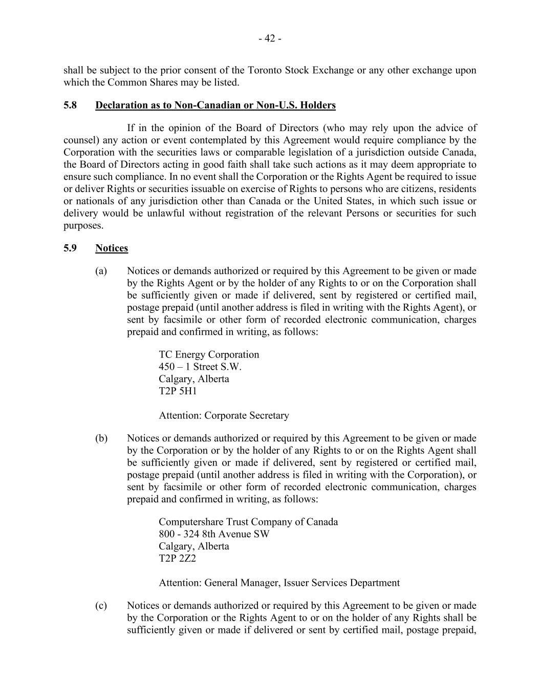 -42-须事先获得多伦多证券交易所或普通股可能上市的任何其他交易所的同意。5.8关于非加拿大或非美国持有人的声明如果董事会(可能依赖律师的建议)认为本协议所设想的任何行动或事件将要求公司遵守加拿大以外司法管辖区的证券法或类似立法,则本着善意行事的董事会应采取其认为适当的行动以确保此类遵守。在任何情况下,均不得要求公司或权利代理人向加拿大或美国以外任何司法管辖区的公民、居民或国民发行或交付在行使权利时可发行的权利或证券,在这种情况下,如果相关人员或证券未为此目的进行登记,则此类发行或交付将是非法的。5.9通知(a)本协议授权或要求由权利代理人或对公司或对公司的任何权利的持有人给予或作出的通知或要求,如交付、以挂号或挂号邮件方式发送、预付邮资(直至另一地址以书面向权利代理人备案)、或以传真或其他形式的记录电子通讯方式发送、预付费用并以书面形式确认,则应充分给予或作出,具体如下:TC Energy Corporation 450 – 1 Street S.W.卡尔加里,Alberta T2P 5H1注意:公司秘书(b)本协议授权或要求由公司或权利代理人的任何权利持有人给予或作出的通知或要求,如果交付、通过挂号或挂号邮件发送、预付邮资(直到另一个地址以书面形式向公司提交)或通过传真或其他形式的记录电子通信发送、预付费用并以书面确认,则应充分给予或作出,具体如下:ComputerShare Trust Company of Canada 800-324 8th Avenue SW Calgary,艾伯塔省T2P 2Z2注意:发行人服务部总经理(c)本协议授权或要求由公司或权利代理人向任何权利持有人或向任何权利持有人发出或作出的通知或要求,如果通过挂号信、预付邮资的方式交付或发送,则应充分给予或作出,