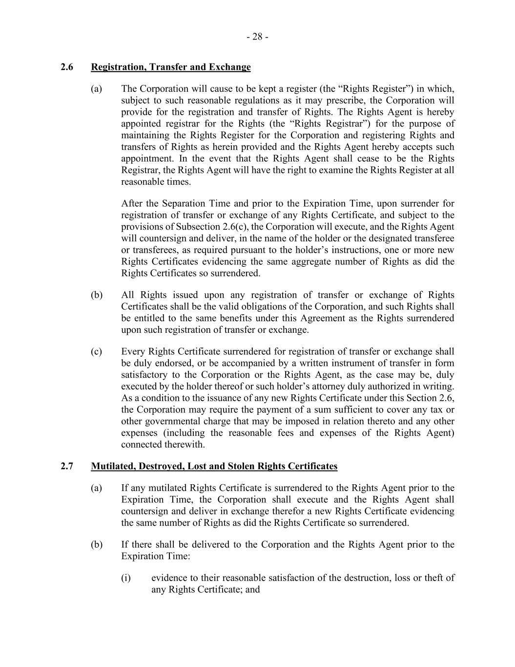 -28-2.6登记、转让及交换(a)公司将安排备存一份登记册(“权利登记册”),在符合其可能订明的合理规例下,公司将在其中就权利的登记及转让作出规定。权利代理人特此委任权利登记官(“权利登记官”),目的是维护公司的权利登记册,并按此处规定登记权利和权利转让,权利代理人特此接受此项委任。在权利代理人不再担任权利登记官的情况下,权利代理人将有权在所有合理时间审查权利登记册。在分立时间后及届满时间前,在交出任何权利证书以进行转让或交换登记时,并在符合第2.6(c)款的规定下,公司将根据持有人的指示,以持有人或指定受让人或受让人的名义签立,并由权利代理人会签及交付一份或多于一份新的权利证书,证明与如此交出的权利证书相同的权利总数。(b)在任何转让或交换权利证书登记时发出的所有权利均为公司的有效义务,而该等权利根据本协议有权享有与在该转让或交换登记时交出的权利相同的利益。(c)为办理转让或交换登记而交还的每份权利证书,均须妥为背书,或附有公司或权利代理人(视属何情况而定)信纳的书面转让文书,由其持有人或该持有人的获妥为书面授权的代理人妥为签立。作为根据本条第2.6条发出任何新的权利证书的条件,公司可要求支付一笔款项,足以支付与此有关的任何税项或其他政府收费,以及与此有关的任何其他开支(包括权利代理人的合理费用及开支)。2.7残废、毁损、灭失、被盗权利证书(a)在到期时间之前将任何残废权利证书交还给权利代理人的,公司应签立,权利代理人应会签并交付一份新的权利证书,作为交换,证明与如此交还的权利证书相同的权利数量。(b)如须在届满时间前交付予公司及权利代理人:(i)令他们合理信纳任何权利证书的销毁、遗失或失窃的证据;及
