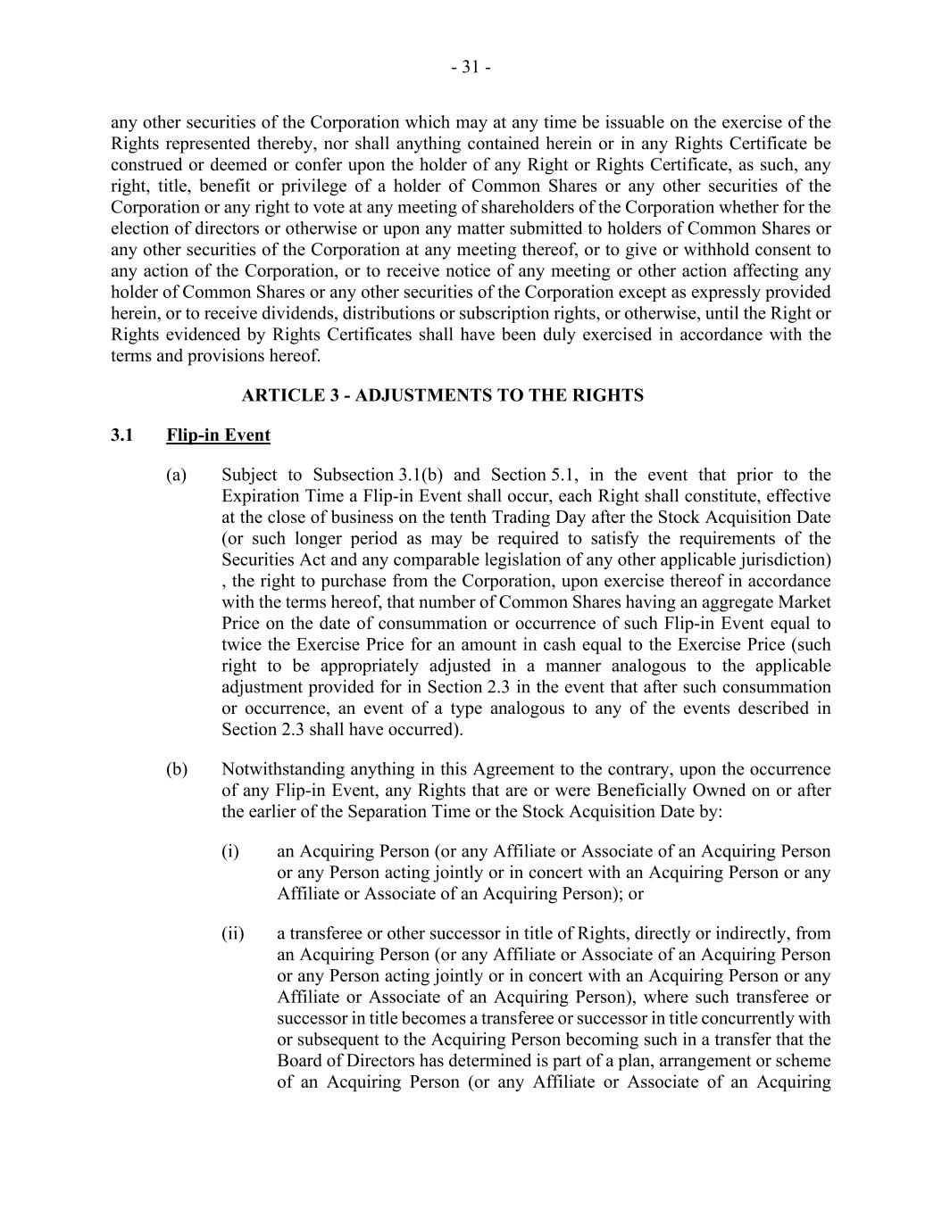 -31-公司的任何其他证券,如在行使其所代表的权利时可随时发行,亦不得解释或视为或授予任何权利或权利证书持有人任何权利、所有权,普通股或公司任何其他证券的持有人的利益或特权,或在公司任何股东大会上投票的任何权利,不论是否为选举董事或其他目的,或就在其任何会议上提交给公司普通股或任何其他证券的持有人的任何事项,或给予或拒绝同意公司的任何行动,或接收影响公司任何普通股或任何其他证券的持有人的任何会议或其他行动的通知,但本文明确规定的除外,或收取股息、分派或认购权,或以其他方式收取,直至权利证书所证明的权利或权利已按照本协议的条款和规定妥为行使为止。第3条-权利的调整3.1翻转事件(a)在符合第3.1(b)款和第5.1节的情况下,如果在到期时间之前发生翻转事件,则每项权利应构成自股票收购日期后第十个交易日(或为满足《证券法》和任何其他适用司法管辖区的任何类似立法的要求而可能需要的更长期限)营业时间结束时生效的从公司购买的权利,在根据本条款行使时,在此类翻转事件完成或发生之日的总市场价格等于行使价格的两倍的普通股的数量(该权利应以类似于第2.3节规定的适用调整的方式进行适当调整,如果在此类完成或发生之后,发生了类似于第2.3节中所述的任何事件的类型的事件)。(b)尽管本协议另有相反规定,但在发生任何翻转事件时,在分立时间或股票收购日期(以较早者为准)或之后由以下人士实益拥有或曾经拥有的任何权利:(i)收购人(或收购人的任何关联公司或关联人或与收购人或收购人的任何关联公司或关联人共同或一致行动的任何人);或(ii)直接或间接的受让人或权利所有权的其他继承人,由收购人(或收购人的任何联属公司或联系人或与收购人或收购人的任何联属公司或联系人共同或一致行动的任何人),凡该等受让人或所有权继承人在董事会已确定为收购人(或收购人的任何联属公司或联系人)的计划、安排或计划的一部分的转让中与收购人同时或之后成为受让人或所有权继承人