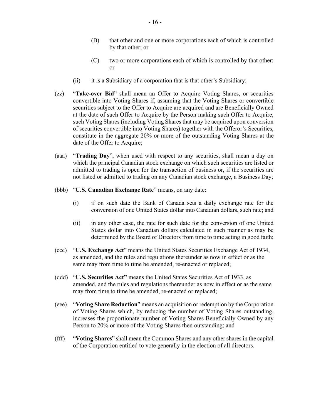 -16-(b)其他及各由该另一方控制的一间或多于一间法团;或(c)各由该另一方控制的两间或多于一间法团;或(ii)是一间公司的附属公司,是该另一方的附属公司;(zz)“收购要约”是指收购有表决权股份的要约,或可转换为有表决权股份的证券,如果,假设受收购要约规限的有投票权股份或可转换证券是由提出收购要约的人收购并于该要约收购日期实益拥有,则该等有投票权股份(包括可转换为有投票权股份的证券转换后可能获得的有投票权股份)连同要约人的证券,合计构成收购要约日期已发行有投票权股份的20%或以上;(aaa)“交易日”,当用于任何证券时,指该等证券上市或获准交易的主要加拿大证券交易所开放进行业务交易的当日,或如该证券未在任何加拿大证券交易所上市或获准交易,则为营业日;(bbb)“美国加拿大汇率”指,在任何日期:(i)如果加拿大银行在该日期设定了将一美元兑换成加元的每日汇率,则该汇率;以及(ii)在任何其他情况下,按董事会不时以善意行事的方式计算的将一美元兑换成加元的该日期的汇率;(CCC)“美国交易法”指经修订的1934年美国证券交易法,其下现行有效或可能不时修订、重新颁布或取代的规则和条例;(ddd)“美国证券法”指经修订的1933年美国证券法,及现已生效或可能不时修订、重新制定或取代根据其订立的规则及规例;(eee)“有表决权股份减少”指公司收购或赎回有表决权股份,通过减少已发行的有表决权股份数量,将任何人实益拥有的有表决权股份的比例数量增加到当时已发行的有表决权股份的20%或更多;(fff)“有表决权股份”指公司股本中有权在全体董事选举中普遍投票的普通股和任何其他股份。