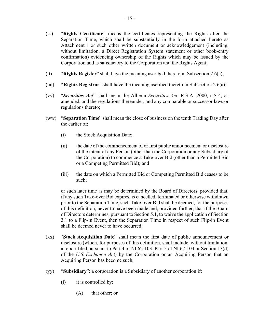 -15-(ss)“权利证书”是指在分离时间之后代表权利的证书,这些证书应基本上采用作为附件1或其他书面文件或确认书所附的格式(包括但不限于,a直接登记制度声明或其他簿记确认书)证明对公司可能签发的权利的所有权,并令公司和权利代理人满意;(tt)“权利登记册”应具有第2.6(a)款赋予的含义;(uu)“权利登记官”应具有第2.6(a)款赋予的含义;(vv)“证券法”应指经修订的《艾伯塔省证券法》,R.S.A. 2000,c.S.-4及其下的条例,(WW)“分立时间”是指以下两者中较早者之后的第十个交易日的收盘时间:(i)股票收购日;(ii)任何人(公司或公司的任何附属公司除外)开始或首次公开宣布或披露开始收购要约的意向的日期(许可要约或竞争性许可要约除外);及(iii)许可投标或竞争许可投标终止的日期;或董事会可能决定的较后时间,但如任何该等收购投标已届满、在分立时间前被取消、终止或以其他方式撤回,则就本定义而言,该等收购投标应视为从未作出,并进一步规定,如董事会根据第5.1节决定放弃第3.1节对翻转事件的适用,那么,与该翻转事件有关的分离时间应被视为从未发生过;(xx)“股票收购日”是指公司或收购人根据NI 62-103第4部分、NI 62-104第5部分或美国交易法第13(d)节提交的报告(就本定义而言,应包括但不限于)收购人已成为此类公司的第一个公开公告或披露日期;(yy)“子公司”:一家公司是另一家公司的子公司,如果:(i)它由:(a)该其他公司控制;或