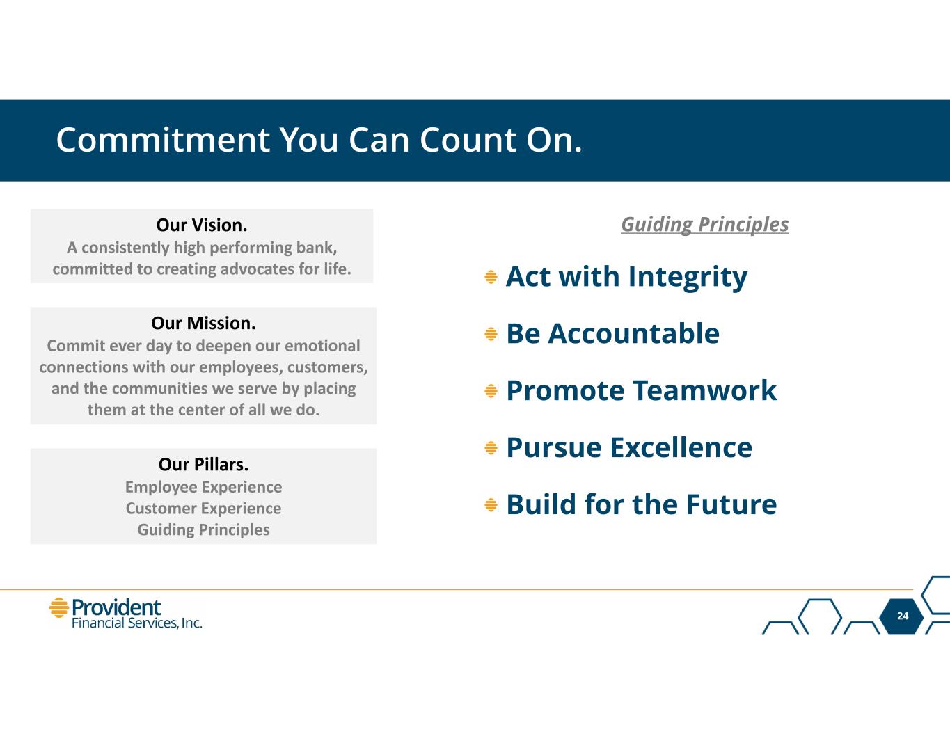 你可以指望的承诺。指导原则法案诚信负责推动团队合作追求卓越为未来构建我们的支柱。员工体验客户体验指导原则我们的使命。致力于每天加深我们与员工、客户和我们所服务的社区的情感联系,将他们置于我们所做一切的中心。我们的愿景。一家持续高绩效的银行,致力于为生活创造倡导者。24