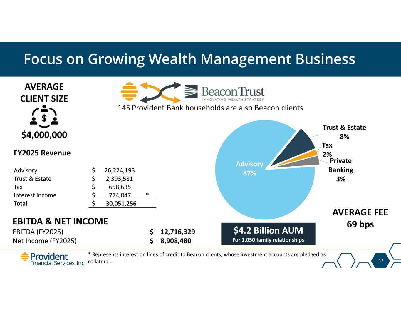 专注于不断增长的财富管理业务咨询87%信托和遗产8%税2%私人银行3% 42亿美元AUM用于1,050个家庭关系FY2025收入26,224,193美元咨询2,393,581美元信托和遗产658,635美元税*774,847美元利息收入30,051,256美元总计*代表Beacon客户的信用额度利息,其投资账户被质押为抵押品。17145个公积金银行家庭也是Beacon客户平均客户规模$ 4,000,000平均费用69 bpsEBITDA &净收入EBITDA(FY2025)$ 12,716,329净收入(FY2025)$ 8,908,480