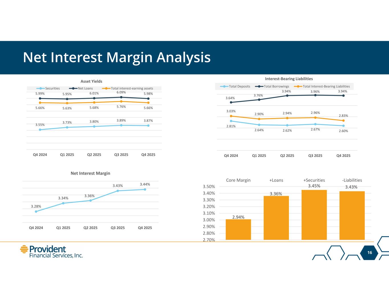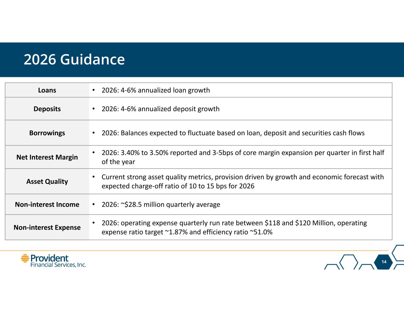 2026年指导• 2026年:贷款年化增长率为4-6 % • 2026年:存款年化增长率为4-6 % • 2026年:预计余额将根据贷款、存款和证券现金流波动借款• 2026年:报告为3.40%至3.50%,上半年每季度核心利润率增长3-5bps净息差•当前强劲的资产质量指标,由增长和经济预测驱动的拨备,预计2026年资产质量的冲销率为10至15个基点• 2026年:季度平均非利息收入约为2850万美元• 2026年:运营费用季度运行率在1.18至1.2亿美元之间,营业费用率目标~1.87%效率比~51.0%非利息费用14