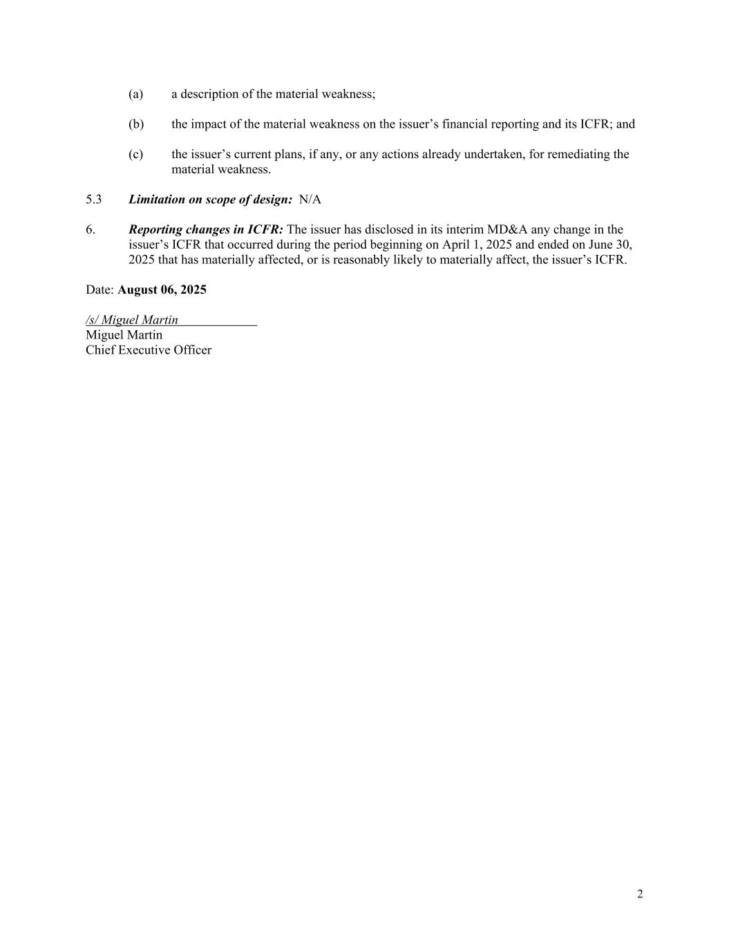 1表格52-109F2认证的临时备案完整证书I,Miguel Martin,Aurora Cannabis Inc.的首席执行官,证明如下:1。回顾:本人已审阅Aurora Cannabis Inc.(“发行人”)截至2025年6月30日止的中期财务报告及中期MD & A(统称“中期申报”)。2.不存在虚假陈述:据本人所知,经合理勤勉尽责,就临时申报所涵盖的期间而言,临时申报不包含任何对重大事实的不真实陈述或遗漏陈述一项需要陈述或根据作出该陈述的情况作出不具误导性的陈述所必需的重大事实。3.公允列报:根据本人所知,经合理勤勉,中期财务报告连同中期申报中包含的其他财务信息在所有重大方面公允列报了发行人截至中期申报中列报的日期和期间的财务状况、财务业绩和现金流量。4.责任:发行人的其他认证人员和我负责为发行人建立和维护披露控制和程序(DC & P)以及财务报告内部控制(ICFR),这些术语在National Instrument 52-109 Certification of Disclosure in Issuers ' Annual and Interim Filings中定义。5.设计:根据第5.2和5.3段所述的任何限制(如有),发行人的其他认证人员和我在临时申报所涵盖的期间结束时(a)设计了DC & P,或使其在我们的监督下设计,提供了合理保证,即(i)与发行人有关的重要信息是由其他人向我们告知的,特别是在编制临时申报期间;以及(ii)发行人要求在其年度申报中披露的信息,其根据证券法提交或提交的临时申报或其他报告在证券法规定的时间段内记录、处理、汇总和报告;(b)设计ICFR,或使其在我们的监督下设计,以根据发行人的公认会计原则就财务报告的可靠性和为外部目的编制财务报表提供合理保证。5.1控制框架:发行人的其他认证人员和我用于设计发行人ICFR的控制框架是Treadway委员会(COSO)发起组织委员会公布的内部控制–综合框架(COSO Framework 2013)。5.2 ICFR –与设计相关的重大缺陷:发行人已在其中期MD & A中披露了在中期期末存在的与设计相关的每项重大缺陷: