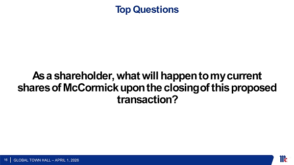 16 16 GLOBAL TOWN HALL – APRIL 1, 2026 16 As a shareholder, what will happen to my current shares of McCormick upon the closing of this proposed transaction? Top Questions