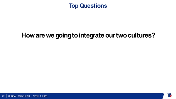 20 20 GLOBAL TOWN HALL – APRIL 1, 2026 20 How are we going to integrate our two cultures? Top Questions