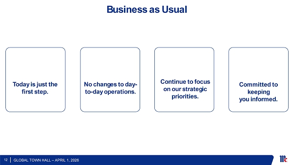 2 2 GLOBAL TOWN HALL – APRIL 1, 2026 Disclosures McCormick Cautionary Statement Regarding Forward Looking Statements Certain information contained in this document that are not statements of historical or current fact constitute “forward - looking statements” within the meaning of Section 21E of the Securities Exchange Act of 1934. These statements may be identified by t he use of words such as “will,” “aim,” “expects,” “anticipates,” “intends,” “looks,” “believes,” “vision,” “ambition,” “target,” “goal,” “plan,” “potential,” “work tow ards,” “may,” “milestone,” “objectives,” “outlook,” “probably,” “project,” “risk,” “continue,” “should,” “would be,” “seeks,” or the negative of these terms and other similar expressions of future performance, results, actions or events, and their negatives, are intended to identify such forward - lookin g statements. Forward - looking statements can be made in writing but also may be made verbally by directors, officers and employe es of McCormick. The forward - looking statements contained in this document include, without limitation, the anticipated benefits of, and our plans, strategies and ob jectives relating to, the pending transaction with Unilever Foods. These and other forward - looking statements are based on management’s current views and assumptions. They are not historical fact s, nor are they guarantees of future performance or outcomes. Many risks, uncertainties and other factors could cause actual fut ure events to differ materially from the forward - looking statements in this communication, including, but not limited to: (i) the parties’ ability to meet expectations r egarding the timing, completion and accounting and tax treatments of the transaction, including changes in relevant tax and o the r applicable laws, and the occurrence of any event, change or other circumstance that could give rise to the termination of the transaction agreement; (ii) the failure to ob tain necessary regulatory approvals, approval of our shareholders, anticipated tax treatment or any required financing, or to sa tisfy any of the other conditions to the transaction, including the risks that a governmental entity may prohibit, delay or refuse to grant approval for the consummat ion of the transaction, may require conditions, limitations or restrictions in connection with such approvals or that such regula to ry approvals may result in the imposition of conditions that could adversely affect the combined company or the expected benefits of the transaction; (iii) the risk that the proposed transaction may not be completed on the terms or in the time frame expected by the parties, or at all; (iv) direct t ra nsaction costs and substantial transition and integration - related costs associated with the proposed transaction with Unilever Foods; (v) the possibility that unforeseen liab ilities, future capital expenditures, revenues, expenses, charges, earnings, synergies, economic performance, indebtedness, f ina ncial condition, losses, future prospects, business and management strategies resulting from the transaction or otherwise could adversely impact anticipated combined co mpa ny metrics and/or the value or expected benefit of, timing or pursuit of the transaction; (vi) the risks and costs of the pur sui t and/or implementation of the anticipated separation of Unilever Foods’ business, including the anticipated timing required to complete the separation, any adjustment to the terms of the transaction and any changes to the configuration of the businesses included in the separation if implemented ; ( vii) uncertainties as to McCormick’s access to available financing to consummate the transaction upon acceptable terms and on a timely basis or at all; (viii) the failur e t o obtain the effectiveness of the registration statements for the transaction or receipt of McCormick shareholder approval fo r t he transaction and certain related matters; (ix) the risk that combined company financial information relating to the transaction, including anticipated combined company reve nue s, earnings, cash flows, capital expenditures, indebtedness and other financial metrics of the combined company; (x) the risk th at the anticipated ownership percentages of McCormick shareholders, Unilever shareholders and Unilever following the closing of the transaction may differ fr om those expected; (xi) the effect of the announcement or pendency of the transaction on Unilever Foods’ or McCormick’s busin ess relationships, competition, business, financial condition and operating results, including risks that the transaction disrupts current plans and operations of Unil eve r Foods or McCormick, the ability of Unilever Foods or McCormick to retain and hire key personnel, risks related to diverting ei ther management team’s attention from ongoing business operations, and risks associated with third - party contracts containing consent and/or other provisions that may be trig gered by the transaction; (xii) the ability of McCormick to successfully integrate Unilever Foods’ operations and implement i ts plans, forecasts and other expectations with respect to Unilever Foods’ business or the combined business after the closing of the transaction; (xii) the ability of McCor mic k to manage additional debt and successfully de - lever following the transaction; and (xiv) the outcome of any legal proceedings that may be instituted against Unilever Foods or McCormick related to the transaction; and other risks described in the company’s filings with the Securities and Exchange Com mission (“SEC”), including McCormick’s Annual Report on Form 10 - K for the year ended November 30, 2025 and Quarterly Report on F orm 10 - Q for the quarter ended February 28, 2026. Actual results could differ materially from those projected in the forward - looking statements. The company 