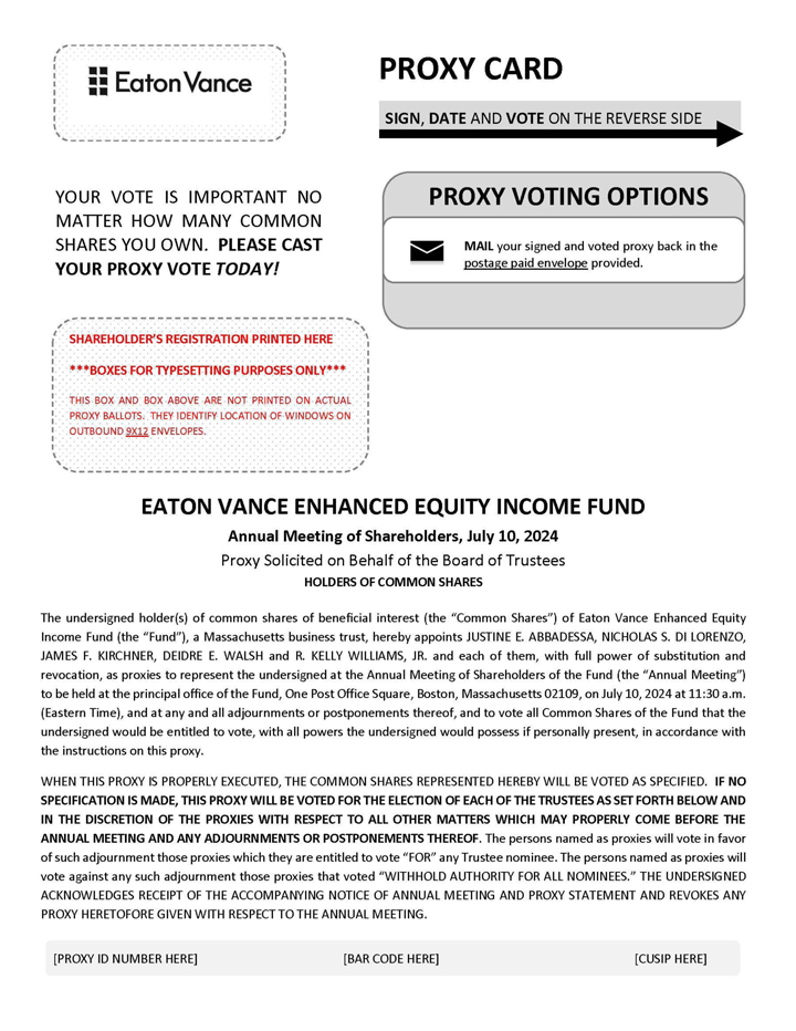 本委托书是在EV增强型收入基金(“基金”)董事会征集代理时提供的。代理人将在基金股东年会及其任何休会或延期(“年会”)上进行投票。年度会议将于2024年7月10日(星期三)上午11:30(美国东部时间)在麻萨诸塞州波士顿邮局广场一号基金主要办公室02109举行,如本文进一步讨论。年度会议将按随附通知所列目的举行。这份代理声明和随附的代理卡将于2024年5月23日或前后首先发送或提供给股东。
