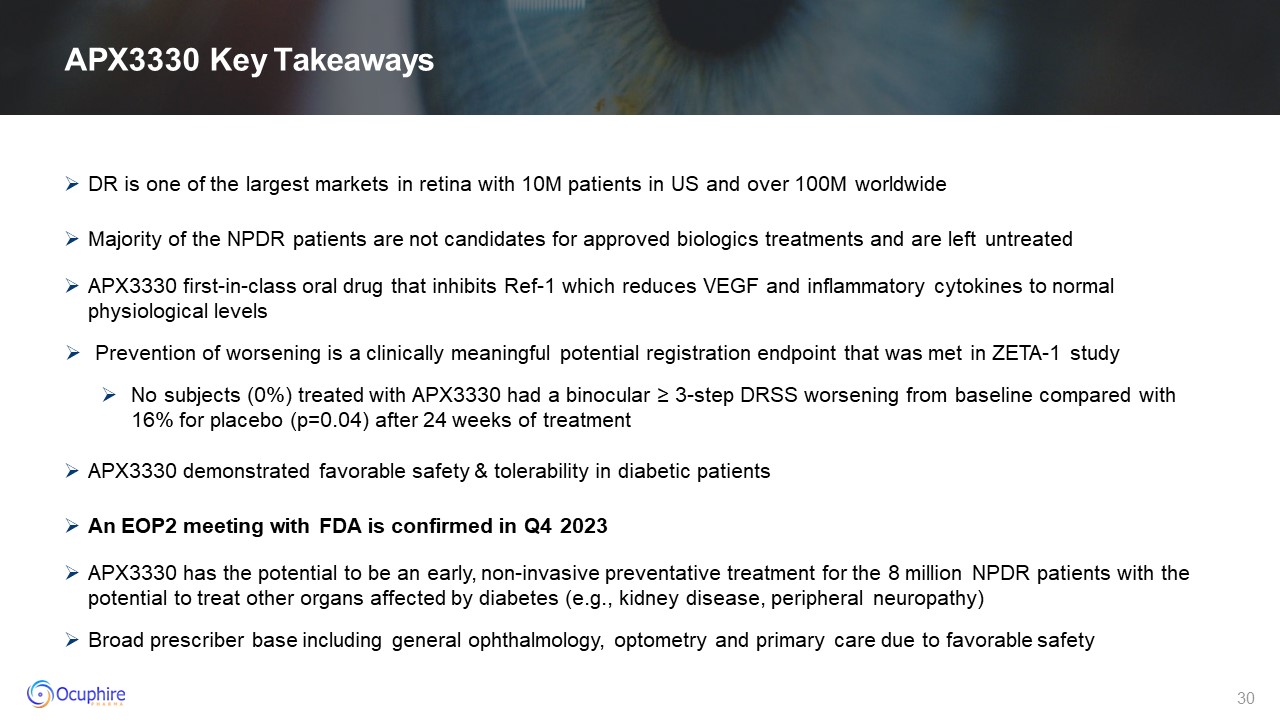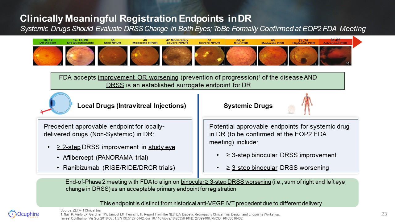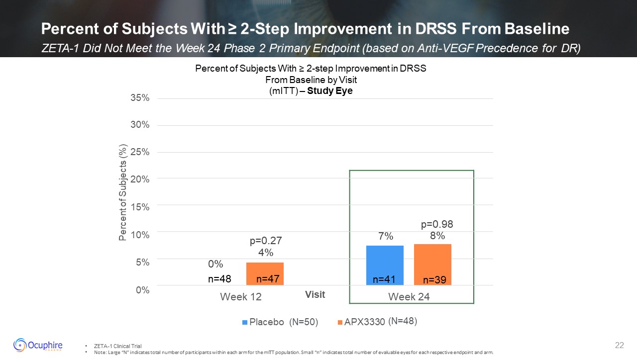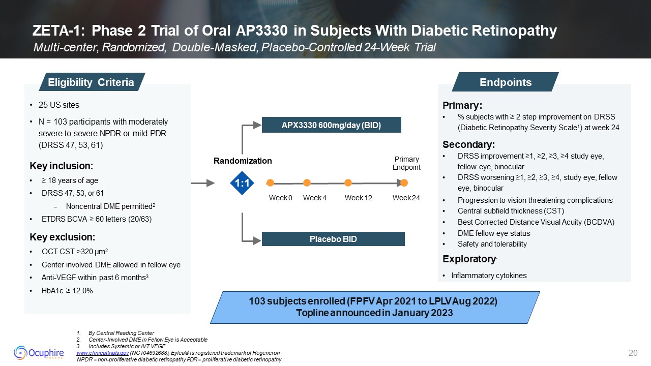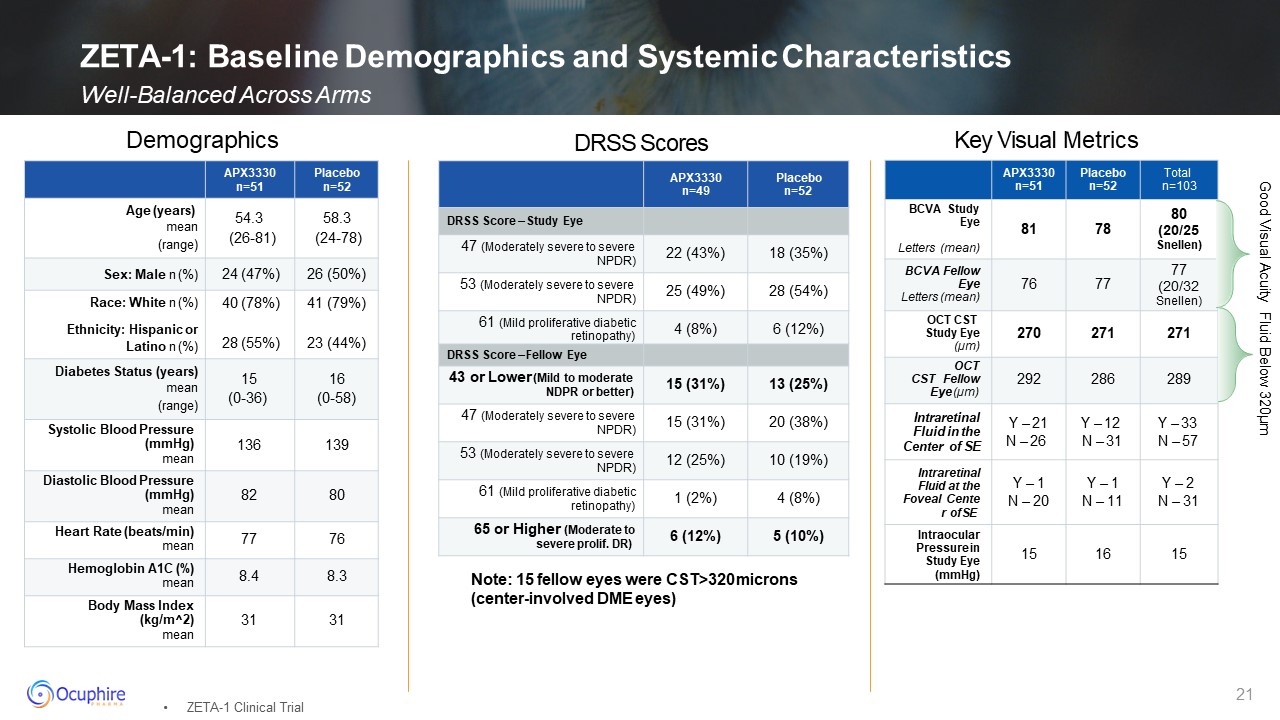20 ZETA-1:口服AP3330在糖尿病视网膜病变受试者中的2期试验多中心、随机、双蒙面、安慰剂对照的24周试验主要:第24周DRSS(糖尿病视网膜病变严重程度量表1)改善≥ 2步的受试者百分比次级:DRSS改善≥ 1,≥ 2,≥ 3,≥ 4研究眼,对眼眼,双眼DRSS恶化≥ 1,≥ 2,≥ 3,≥ 4,研究眼,对眼眼,双眼进展为威胁视力的并发症中心亚视野厚度(CST)最佳矫正距离视力(BCDVA)DME同眼状态安全性和耐受性探索性:炎性细胞因子终点25个美国位点N = 103名中度重度至重度NPDR或轻度PDR(DRSS 47,53,61)的参与者关键纳入:≥ 18岁DRSS 47,53,或61非中枢性DME permitted2 ETDRS BCVA ≥ 60个字母(20/63)关键排除:OCT CST > 320 µ m2中心参与的DME允许在同侧眼睛中抗VEGF在过去6个月内3 HbA1c ≥ 12.0%资格标准103受试者入组(FPFV Apr 2021 to LPLV Aug 2022)Topline announced in January 2023 1:1 By Central Reading Center中心参与的DME在同侧眼睛中是可接受的包括系统性或IVT VEGF www.clinicaltrials.gov(NCT04692688);Eylea ®是再生元制药注册商标NPDR =非增殖性糖尿病视网膜病变PDR =增殖性糖尿病视网膜病变第0周第12周第24周第4周主要终点APX3330 600mg/天(BID)安慰剂BID随机化