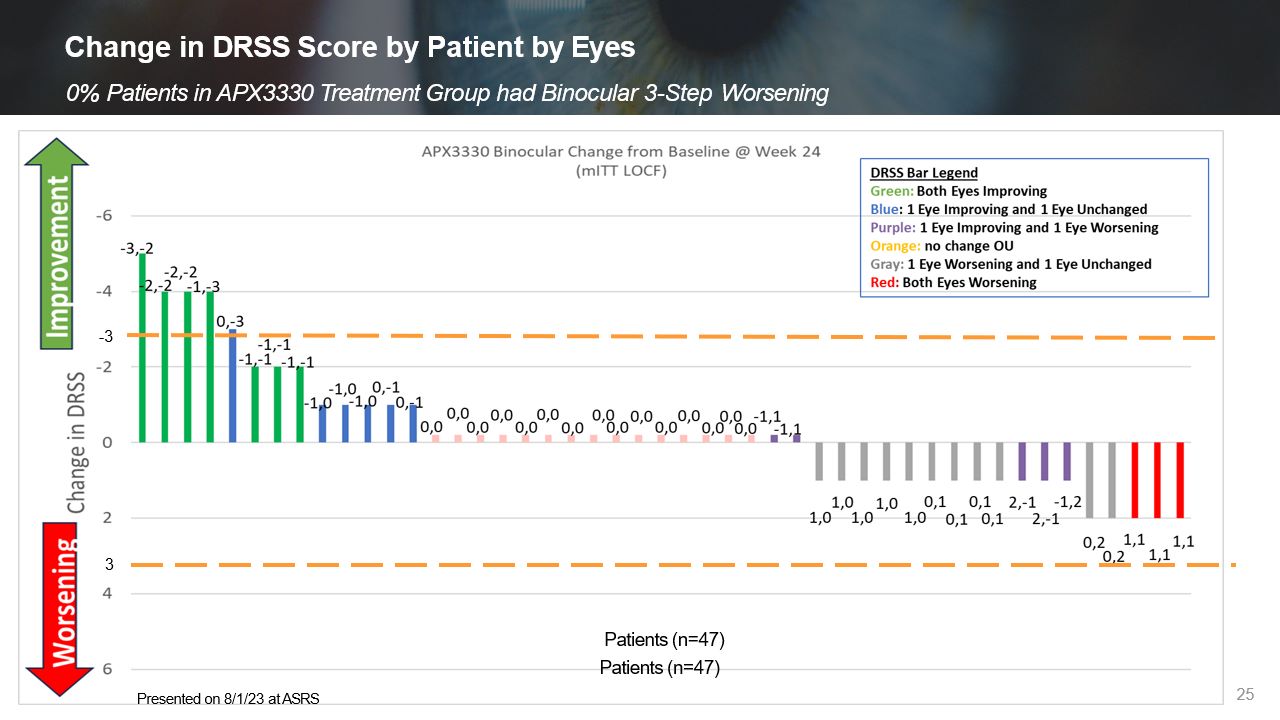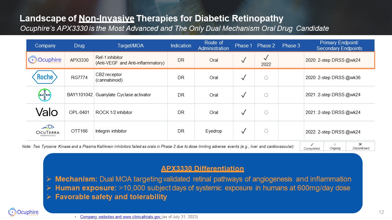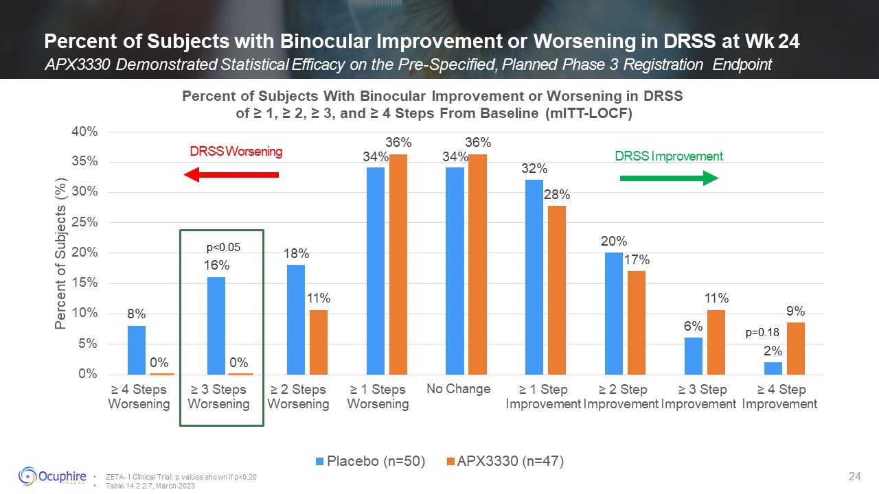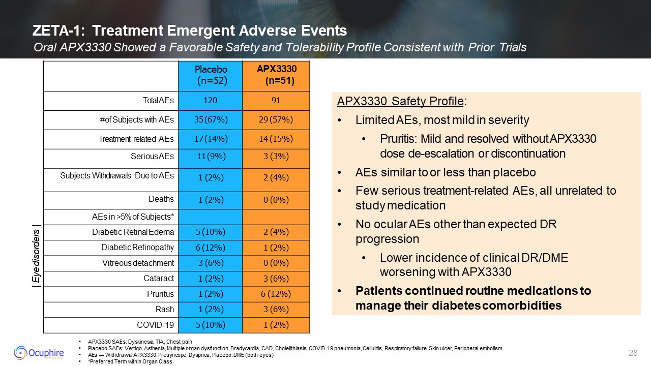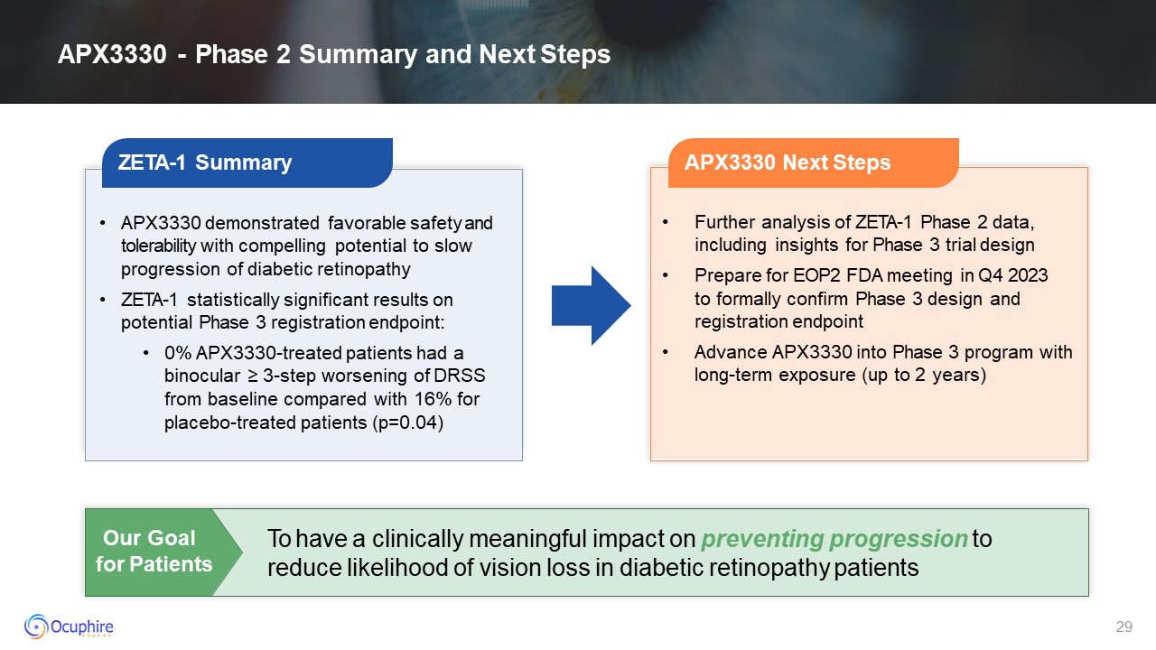 20 ZETA-1:口服AP3330在糖尿病视网膜病变受试者中的2期试验多中心、随机、双蒙面、安慰剂对照的24周试验主要:第24周DRSS(糖尿病视网膜病变严重程度量表1)改善≥ 2步的受试者百分比次级:DRSS改善≥ 1,≥ 2,≥ 3,≥ 4研究眼,对眼眼,双眼DRSS恶化≥ 1,≥ 2,≥ 3,≥ 4,研究眼,对眼眼,双眼进展为威胁视力的并发症中心亚视野厚度(CST)最佳矫正距离视力(BCDVA)DME同眼状态安全性和耐受性探索性:炎性细胞因子终点25个美国位点N = 103名中度重度至重度NPDR或轻度PDR(DRSS 47,53,61)的参与者关键纳入:≥ 18岁DRSS 47,53,或61非中枢性DME permitted2 ETDRS BCVA ≥ 60个字母(20/63)关键排除:OCT CST > 320 µ m2中心参与的DME允许在同侧眼睛中抗VEGF在过去6个月内3 HbA1c ≥ 12.0%资格标准103受试者入组(FPFV Apr 2021 to LPLV Aug 2022)Topline announced in January 2023 1:1 By Central Reading Center中心参与的DME在同侧眼睛中是可接受的包括系统性或IVT VEGF www.clinicaltrials.gov(NCT04692688);Eylea ®是再生元制药注册商标NPDR =非增殖性糖尿病视网膜病变PDR =增殖性糖尿病视网膜病变第0周第12周第24周第4周主要终点APX3330 600mg/天(BID)安慰剂BID随机化